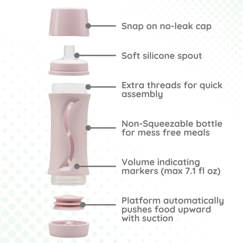The Complete Starter set includes the Subo Baby Food Bottle as well as the 5mm Straw Spout. The food bottle allows babies, toddlers and children to feed themselves independently. It is great for use on-the-go and works best with healthy homemade purees, smoothies, yogurts and mashed foods. When it comes to self-feeding, our baby food bottle is the perfect solution for both parents and children, creating a way for little ones to feed themselves without the potential of a big mess. The reusable, refillable food bottle helps families save money and be more environmentally friendly by eliminating the need to buy and dispose of expensive, single-use squeezable pouches and packaged foods. They can even replace messy reusable squeeze pouches. Because the food bottle is non-squeezable, and has a spout it helps children eat more, and prevents them from creating a wasteful mess. Children as young as 4 months can easily sip the food from their baby food bottle feeder using the soft silicone spout. They can watch as the platform automatically moves up the bottle! The viewing windows allow both parents and children to see where the platform moves. It tells them how much food is left inside, making this baby food bottle a must for any child who is self-feeding. Can Replace: Baby squeeze pouches, food pouches, silicone squeeze pouches, reusable squeeze pouches, honey bears & yogurt pouches. Product Specifications The Baby Food Bottle Starter Set comes standard with the original spout (12mm opening) and the straw spout (5mm opening).