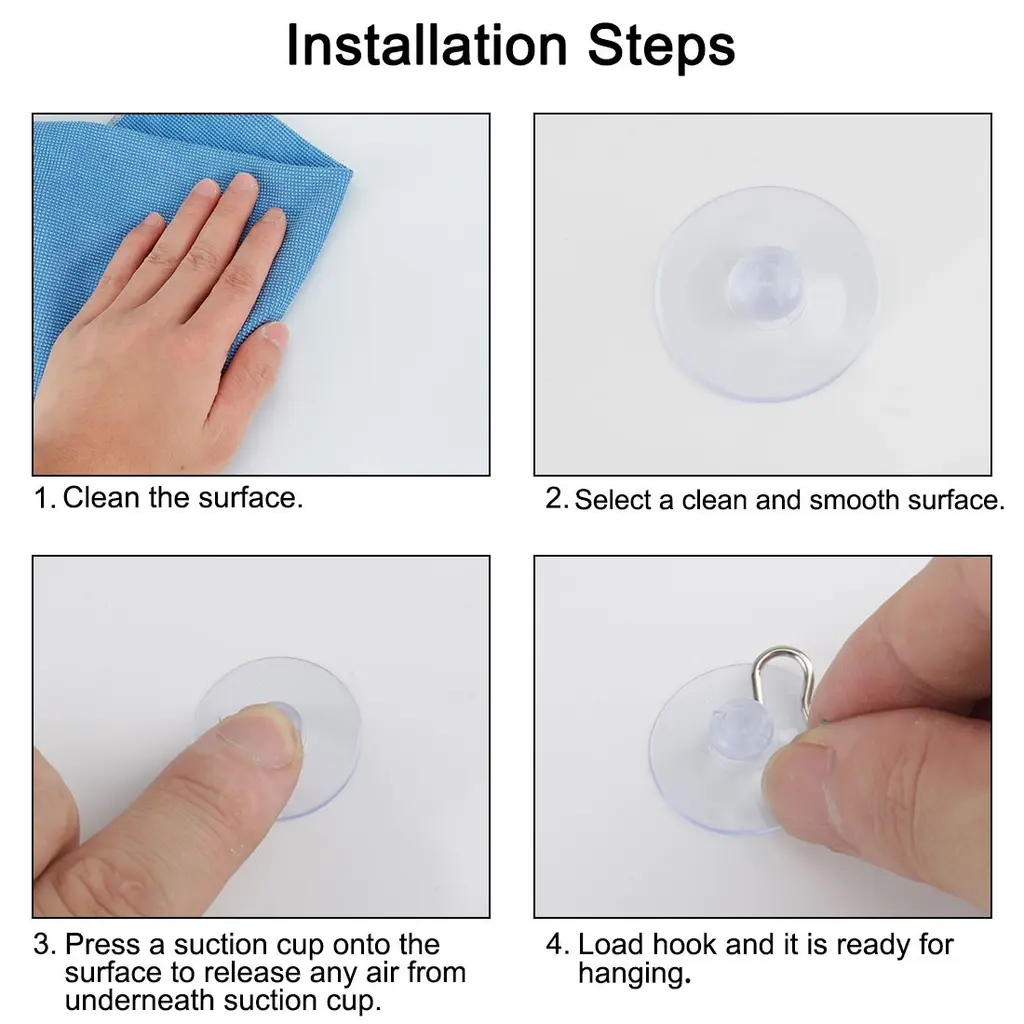1.Suction cup hooks are made of the best quality PVC material. which is durability, oil, water, dust resistant for long-term using. Also can prevent yellowing caused by oxidation.2.Just press the suction cup on a flat surface for hanging objects no harm to the surface; release tab for easy removal, no tools needed, install and tear off only a few seconds.3.Widely used in kitchen, drawing room, bedroom, bathroom, utility room, garage, flower house. office, warehouse, market and store hanging decorations.4.These suction cup hooks will work with most flat surfaces including ceramic tiles, windows, mirrors, glass, metal, fiberglass.5.You can use them in the kitchen hanging for kitchenware, utensils, spoons, coffee mugs, kitchen towels, gloves, save lots of space in the kitchen.Specification:Product Name: Suction Cup HooksMaterial: PVC, MetalTotal Size: 28 x 25 x 20mm/1.1" x 1" x 0.8"(L*W*H)Hook Length: 10mm/0.4"Width of Opening: 10mm/0.4"Maximum load capacity for each: 0.2 KG/0.4 lbsInstallation Steps1. Select a clean and smooth surface2. Make the surface clean, dry, and under 40 degrees.3. Press suction cup onto surface to release any air from underneath suction cup.4. Test objects for security to assure suction is secure.Tips:Does NOT work well on wood, stained glass, and surfaces that are rough, uneven, or textured.If the hooks lose its suction due to long time use, please rinse it under hot water, then it will work again.Do not expose the suction hooks under sunlight, which might fade the suction color.