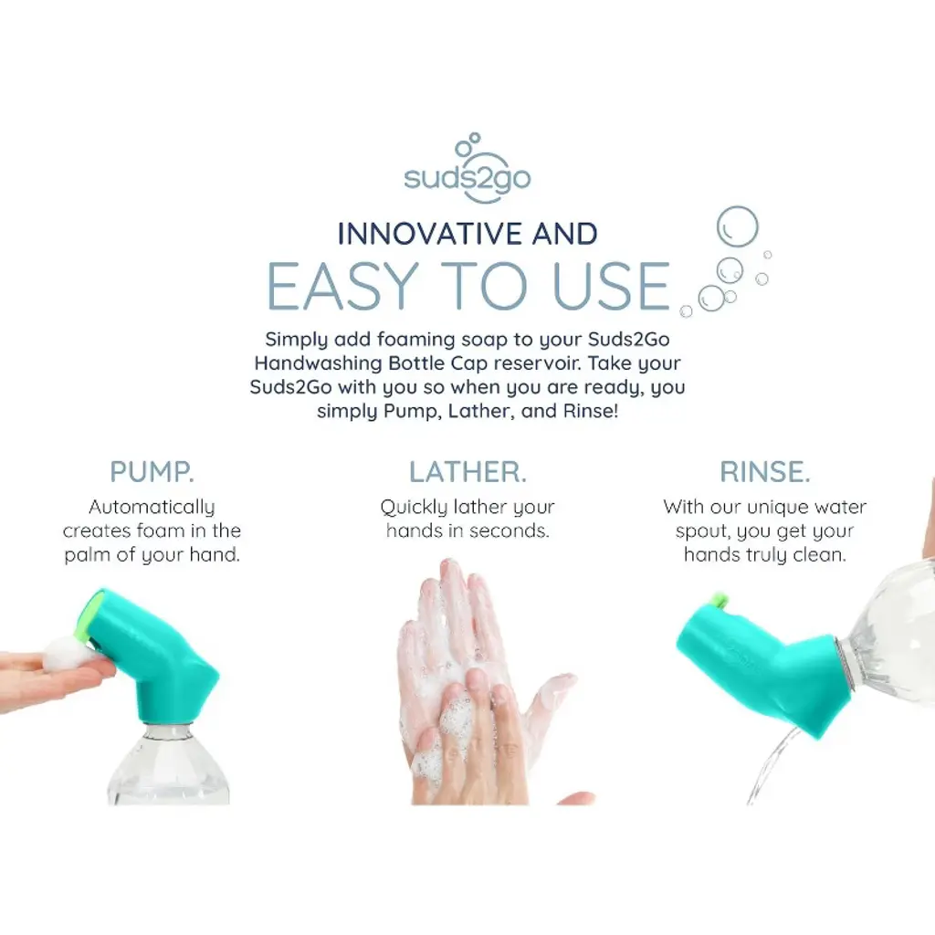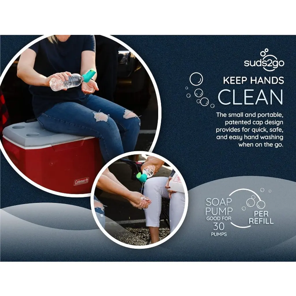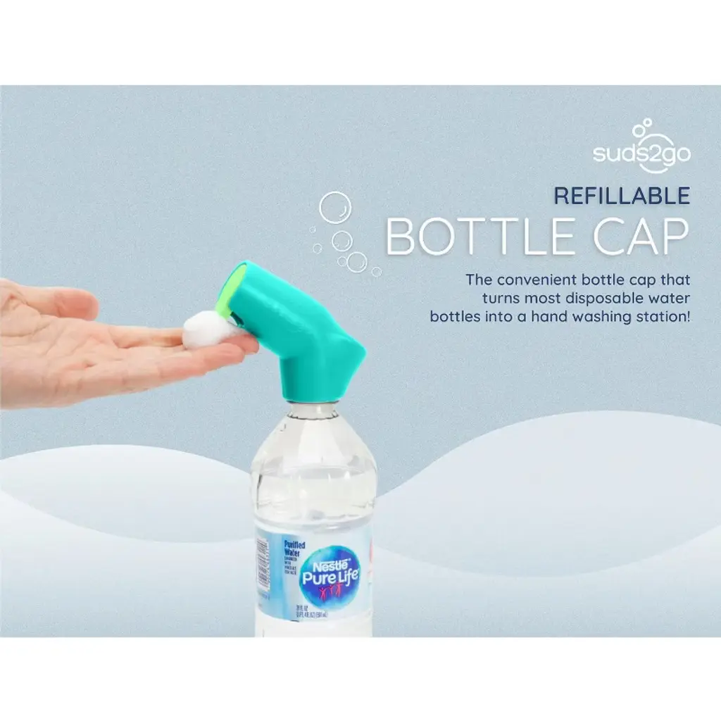 Suds2Go Refillable Caps turn ordinary disposable water bottles into convenient handwashing stations. Designed with a built-in refillable soap chamber, these caps offer a portable, eco-friendly solution for hygiene on the go. Ideal for travel, hiking, road trips, and outdoor activities, the universal fit ensures compatibility with most standard bottles. Durable and reusable, they're perfect for families, campers, and anyone looking to stay clean wherever they are.