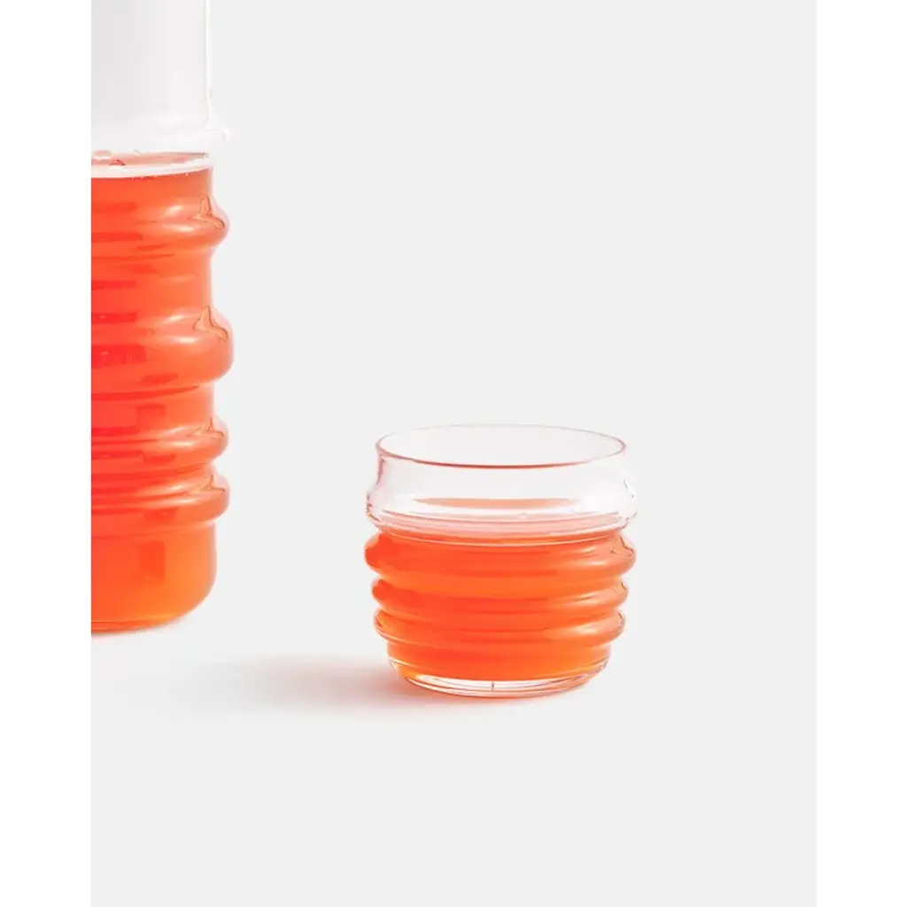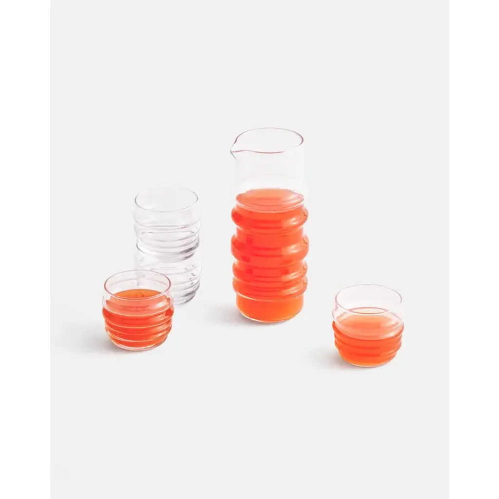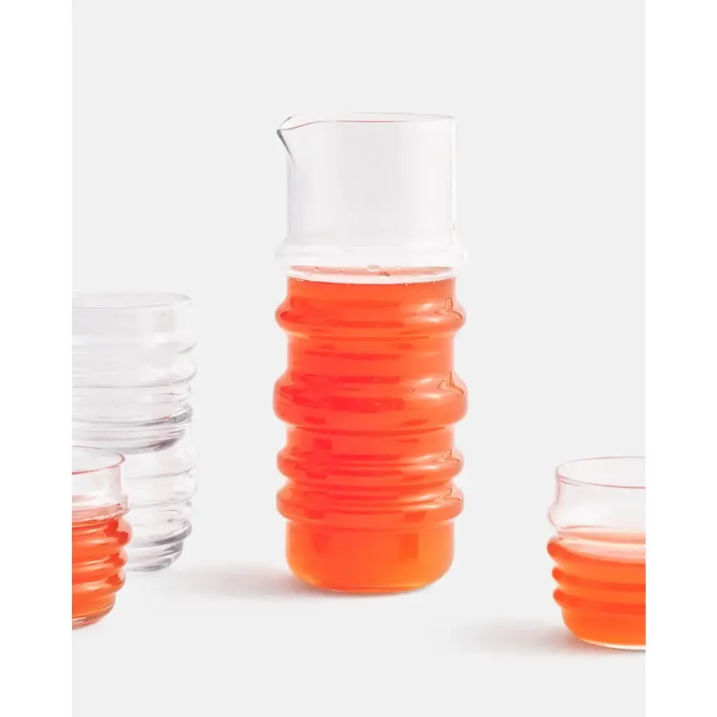 Marimekko’s Sukat Makkaralla pitcher adds joy and character to any table setting. The wavy decoration of the pitcher gives the collection its delightful name and appearance. Sukat Makkaralla ("Socks Rolled Down") is a series of glassware designed by Anu Penttinen for Marimekko in 2010. The collection has references to the traditions of Finnish glass design while simultaneously adding something completely new to it. Like a person with their socks rolled down, the Sukat Makkaralla glasses are natural and liberated, self-assured individuals.