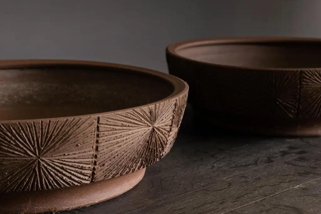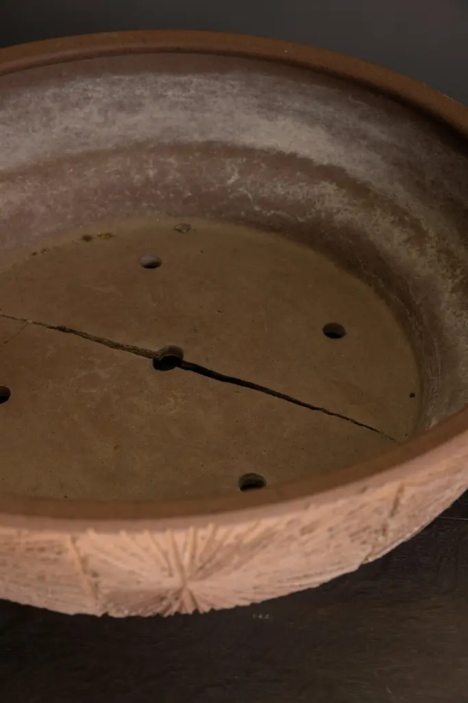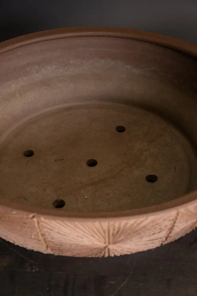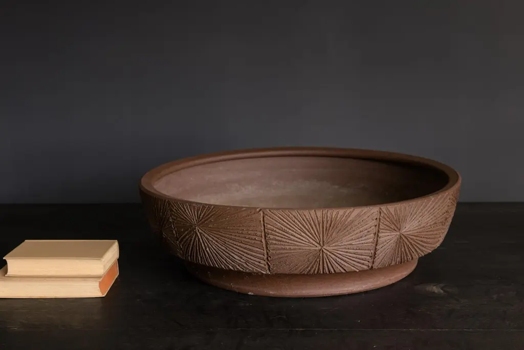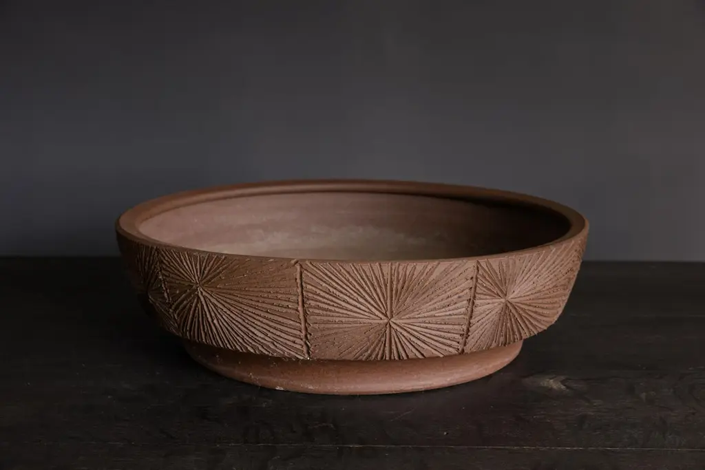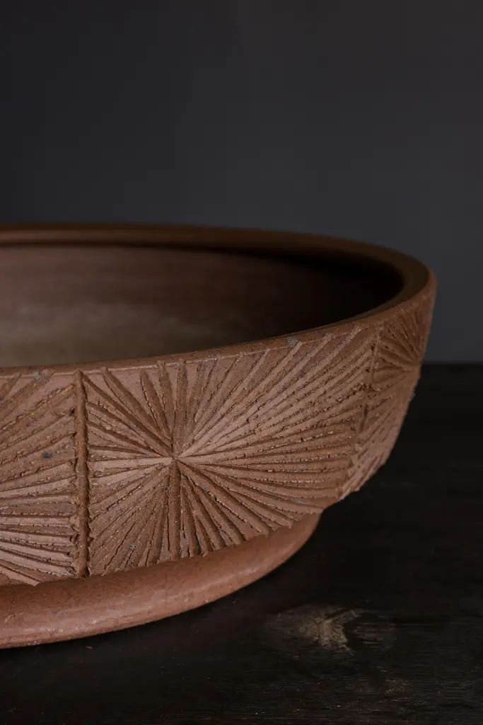 "Sunburst" Dish Planter by David Cressey & Robert Maxwell for Earthgender, Early 1970's, USAUnglazed Reduction-Fired StonewareH 8.5" x D 30"FDV11243Wear consistent with age and use. Five drainage holes.