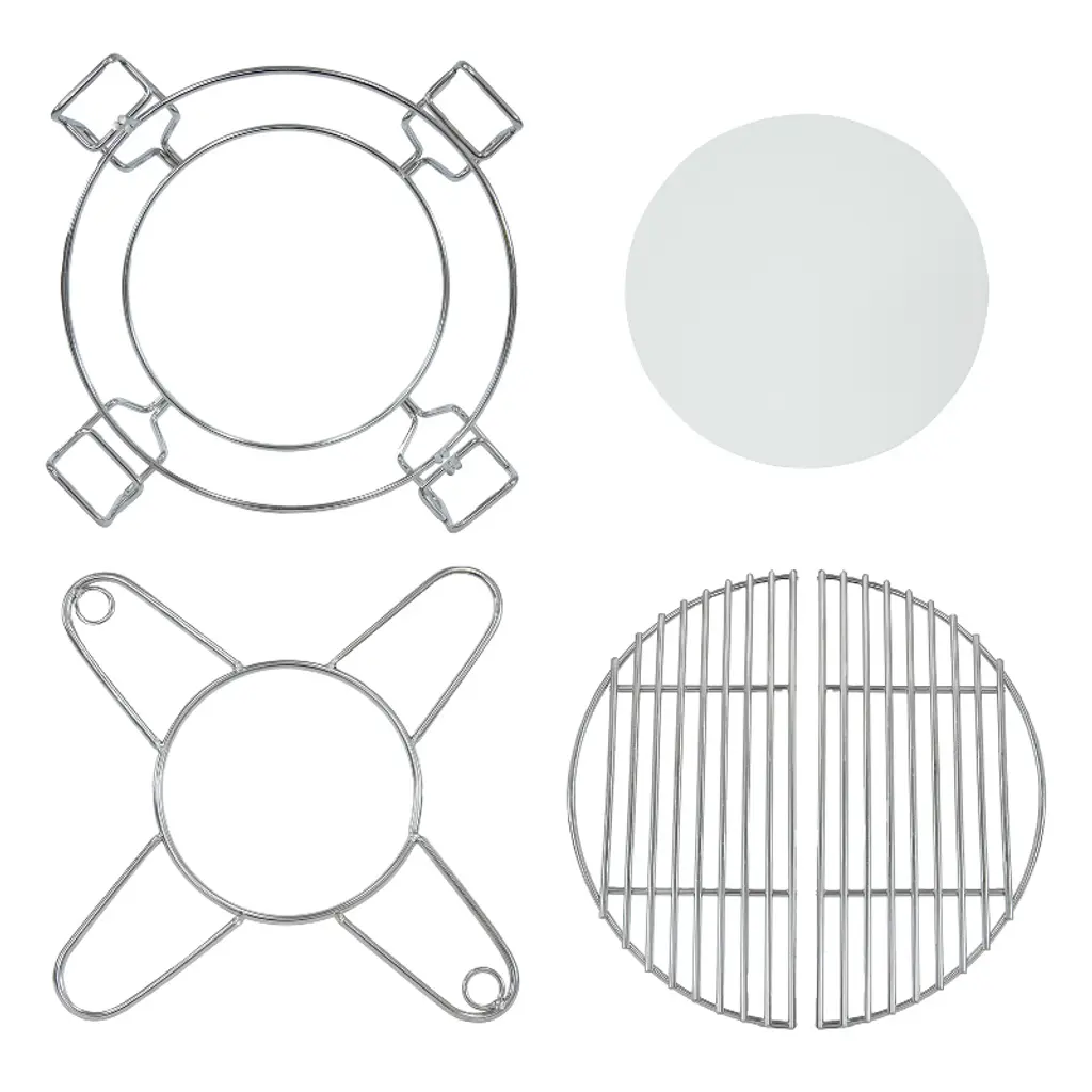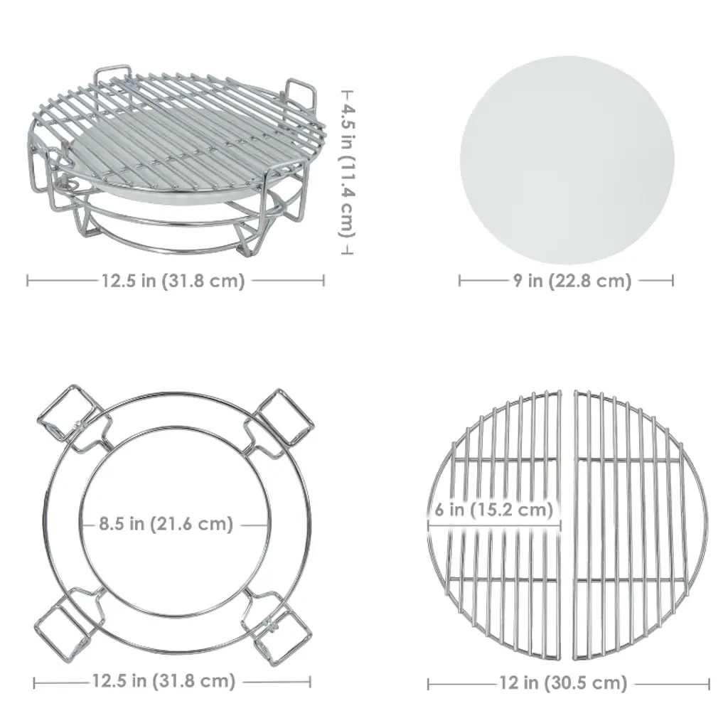 Enhance the experience of grilling on a kamado with the half moon flexible cooking system. This innovative system features a stainless steel cooking grate, offering exceptional durability and resistance to rust and corrosion. The grate conveniently splits into two pieces, providing versatile cooking configurations and ease of handling and cleaning. The ceramic deflector plate ensures consistent heat distribution and allows the creation of two cooking zones. This design enables seamless switching between direct and indirect cooking methods. On one side of the grill, sear steaks to a flawless finish, while on the other, slow-cook or smoke delicate foods to achieve exceptional tenderness and flavor. The ceramic material maintains even heat retention, preventing hot spots and enhancing the overall taste of dishes. The stainless steel cooking grate expands grilling capabilities and simplifies the cooking process. A great tool for both seasoned grill masters and weekend BBQ enthusiasts, this system combines convenience, versatility, and outstanding performance in outdoor cooking.• FOR 15" KAMADO GRILLS: The multi-way cooking system is designed to be used on kamado grills that have a 15" cooking area. The cooking system measures 12.5" W x 12.5" D x 4.5" H overall and weighs 5.2 lbs. The steel grate is 12" in diameter when used as a whole. Each half moon grate measures 6" W x 12" H. The ceramic plate is 9" in diameter x 0.25" H.• ENHANCED DURABILITY: Crafted from high-quality stainless steel, the half moon grate is resistant to rust, corrosion, and high temperatures, ensuring long-lasting performance and reliability for all grilling needs. The deflector plate is made from ceramic to evenly distribute heat while cooking.• VERSATILE COOKING OPTIONS: The innovative half moon design allows for flexible cooking configurations. Use the stainless steel grate for direct grilling on one side while utilizing the ceramic heat deflector plate on the other for indirect cooking, smoking, or roasting, providing the freedom to cook multiple dishes simultaneously. The ceramic heat deflector plate helps to evenly distribute heat across the cooking surface, preventing hot spots and ensuring the food is cooked evenly every time.• IMPROVED FLAVOR RETENTION: The combination of stainless steel and ceramic materials enhances the flavor of food. The kamado grill grate sears meats to lock in juices, while the ceramic deflector plate retains heat and moisture, resulting in more tender and flavorful dishes.• WORRY-FREE PURCHASING: Sunnydaze Decor backs its products with a 1-year manufacturer's warranty.