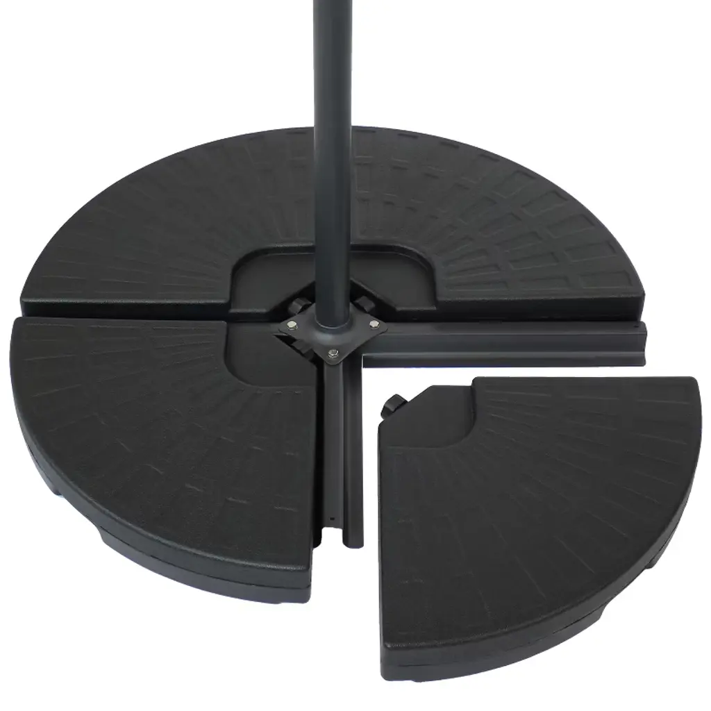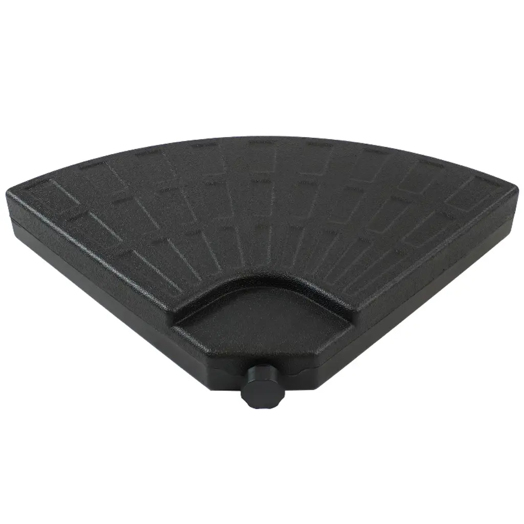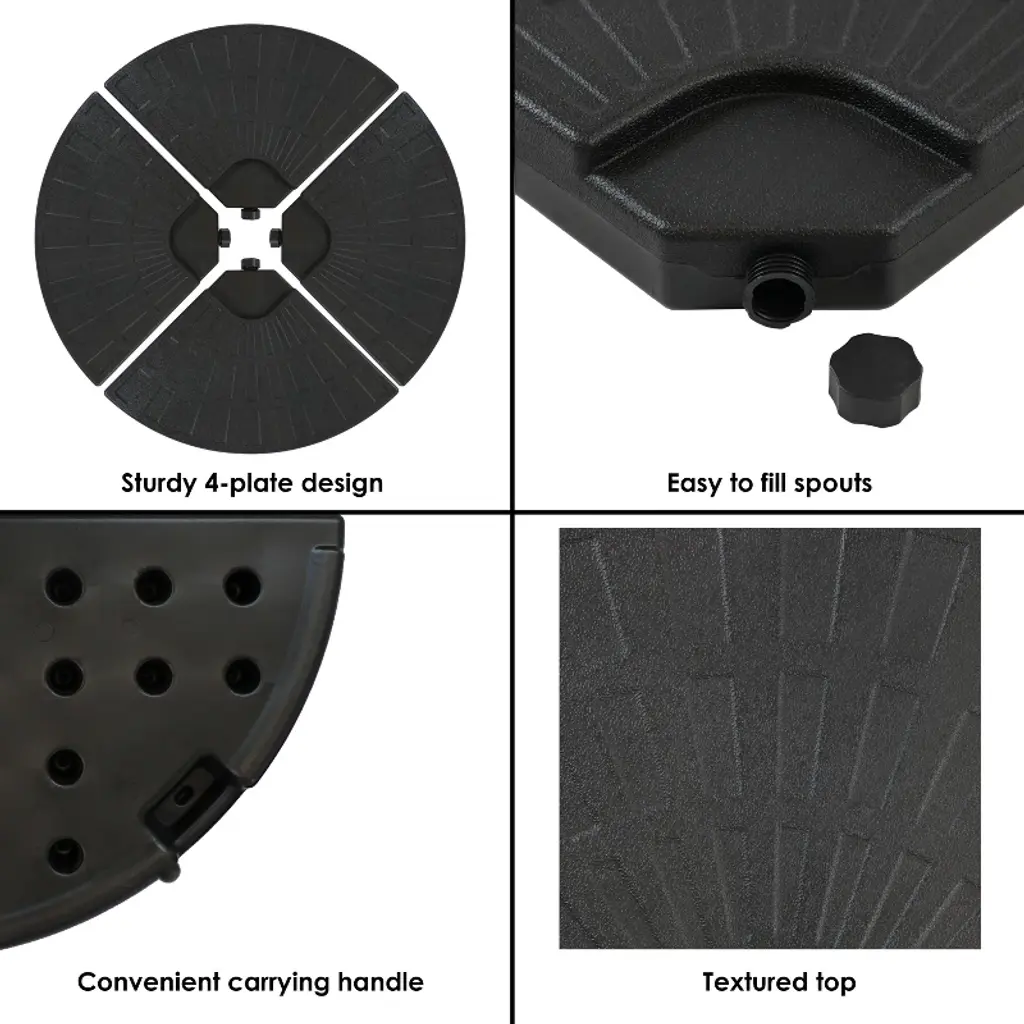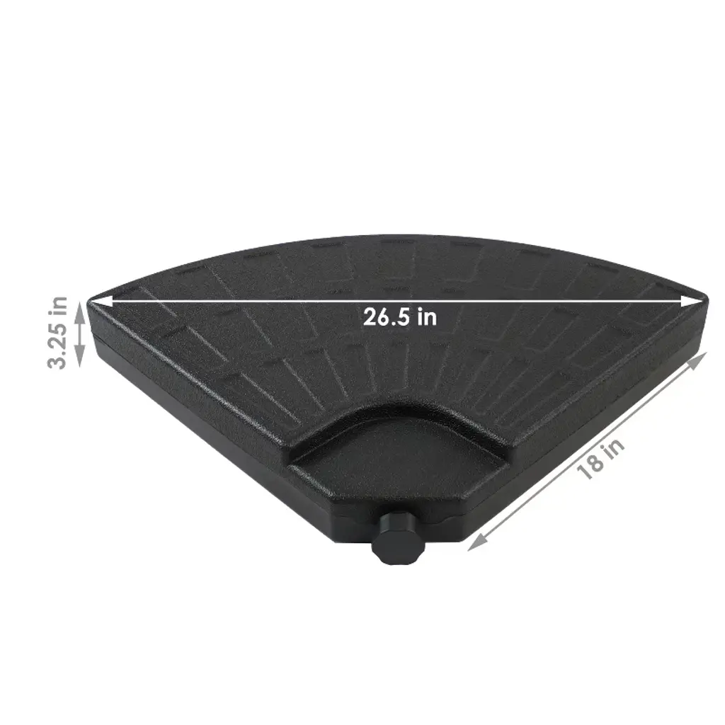 Keep cantilever umbrellas stable and secure with this four-piece offset umbrella base set. Designed to form a round base when assembled, each plate is crafted from durable polyethylene for long-lasting, weather-resistant performance. The molded plastic resists cracking, fading, and wear, making it a reliable choice for outdoor use season after season. Each plate features an easy-to-access fill spout, allowing for quick filling and emptying as needed. Use water or sand to add weight and ensure the umbrella remains upright and supported, even in breezy conditions. When fully filled, the base provides the stability required for safe, hands-free shade coverage. The modular design allows for straightforward setup and storage, while the textured finish adds a clean, functional look. Whether set up on a patio, deck, or poolside, this offset umbrella base set delivers dependable support without compromising on convenience.• VERSATILE 4-PIECE SET: This umbrella base includes four plates that form a round base, providing adaptable and even weight distribution. Each base plate measures approximately 18" D x 26.5" W x 3.25" H, weighs 3.8 lbs, and holds about 33 lbs of water or 50 lbs of sand.• DURABLE CONSTRUCTION: Made from heavy-duty polyethylene, these cantilever base plates are durable enough for extended outdoor use in various weather conditions.• EASY TO FILL AND USE: Each plate features a convenient spout for quick filling with water or sand and simple emptying when needed. • VERSATILE AND STABLE SUPPORT: This set of umbrella base plates is designed to securely weigh down offset umbrellas for balanced, reliable placement. They can be used outside on the porch, deck, lawn, backyard, or even by the pool to ensure the umbrella won't tip over.• WORRY-FREE PURCHASING: Sunnydaze Decor backs its products with a 1-year manufacturer's warranty.