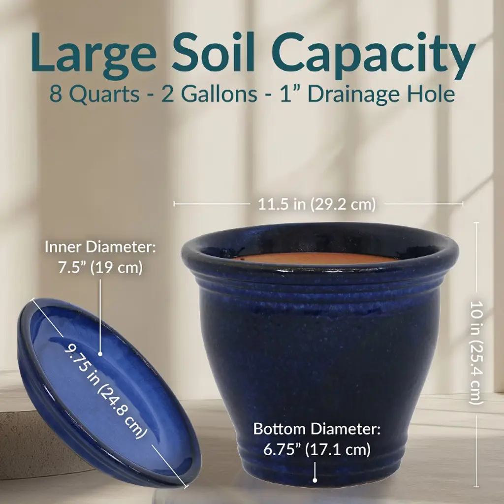The glazed ceramic planter set combines timeless craftsmanship with functional design. These planters accommodate a wide variety of medium to small plants, from vibrant blooms and greenery to herbs. Constructed from durable ceramic, the decorative flowerpots offer a stable and insulated environment, shielding plant roots from temperature fluctuations. The smooth, glazed finish enhances their appearance with a sleek, polished look while also providing a moisture-resistant surface for easy maintenance. Designed to complement a range of indoor and outdoor settings, these planters bring sophistication to patios, porches, living rooms, and gardens alike. A drainage hole in the bottom of each planter promotes healthy root systems by preventing overwatering. The saucers have a raised edge to collect excess water and soil spillage to minimize messes. Use them in the house, on the patio, deck, or porch and watch plants thrive.• MEDIUM SIZE FOR GROWING PLANTS: Each ceramic plant pot has a 2-gallon soil capacity that provides space for growing plants, herbs, and flowers. The planters have an 11.5" outer top diameter (10" inner diameter), a 6.75" outer base diameter (6" inner base diameter), and a 10" outer height (9" inner). Each planter weighs 10.4 lbs and has a 1" drainage hole. The saucers have a 9.75" outer diameter (7.5" inner) and a 1.5" H outer edge (0.75" H inner edge). Each saucer weighs 2.8 lbs.• DESIGNED FOR BEAUTY AND DURABILITY: These ceramic pots are crafted with a rich, hand-painted glazed finish that is kiln-fired for a classic, shining appearance. Subtle variations in color highlight the artisanal glazing process, making each piece truly unique. The durable ceramic construction offers natural UV and frost resistance, while their weight adds stability to outdoor arrangements, keeping the planters upright in windy conditions.• PROVIDES INSULATION FOR ROOTS: The ceramic flowerpots provide good insulation for plant roots, protecting them from extreme heat or cold as they grow. The design and size of this set of 2 planters make it great for growing a variety of plants, from small plants, flowers, herbs, and vegetables.• VERSATILE PLACEMENT: Use these round garden planters on the patio, deck, or porch to add flowers to outdoor spaces, or set the planters in the sunroom, living room, or dining room to bring life to indoor spaces. Place the saucer beneath each flowerpot to prevent water and soil from leaking on the floor when used indoors. The drainage hole in the bottom of each pot provides optimal air circulation and prevents water from pooling.• WORRY-FREE PURCHASING: Sunnydaze Decor backs its products with a 1-year manufacturer's warranty.
