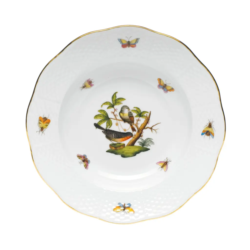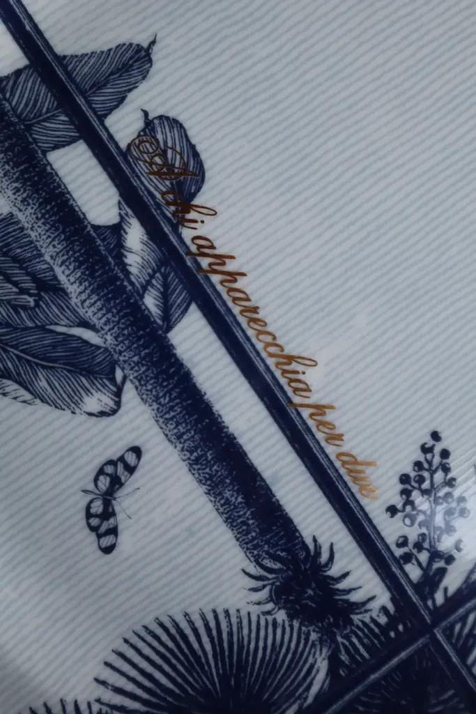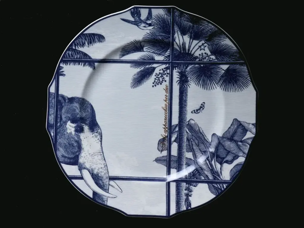 Placeholder Plate made on the design of the Ginori 1735 "Duchessa" Collection with "La Gabbia" Decoration and brilliant gold writing "A CHI APPARECCHIA PER DUE"La Gabbia is the first Capsule Collection, Limited Edition of the Suonare Stella Brand created in collaboration with Richard Ginori and designed by Ludovica + Roberto Palomba. La Gabbia is a story, a dream scene, a fusion of small whispered tales, scenes of secret encounters and hidden messages that give life to a new world. Flora and fauna blend harmoniously in the large meshes of La Gabbia.La Gabbia is a metaphor: the limit sometimes exists and sometimes it doesn't, sometimes others impose it on us or social conventions, sometimes we do everything by ourselves, sometimes it opens up to the space of an endless horizon and sometimes it closes in on difficulty in overcoming the obstacle.Paolo Stella was able to tell his story through the vulnerability in which he imbued the words of his first book, Meet me alla boa, where he was, unconsciously, shown in his emotional nudity that he decided to also write on the place markers, in pure gold , such as sincere promises.