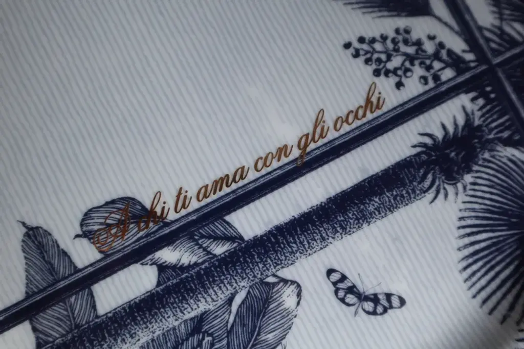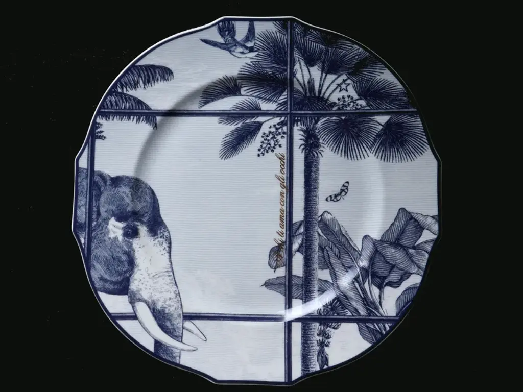 Placeholder Plate made on the design of the Ginori 1735"Duchessa" Collection with "La Gabbia" Decoration and brilliant gold writing "A CHI TI AMA CON GLI OCCHI"La Gabbia is the first Capsule Collection, Limited Edition of the Suonare Stella Brand created in collaboration with Richard Ginori and designed by Ludovica + Roberto Palomba. La Gabbia is a story, a dream scene, a fusion of small whispered tales, scenes of secret encounters and hidden messages that give life to a new world. Flora and fauna blend harmoniously in the large meshes of La Gabbia.La Gabbia is a metaphor: the limit sometimes exists and sometimes it doesn't, sometimes others impose it on us or social conventions, sometimes we do everything by ourselves, sometimes it opens up to the space of an endless horizon and sometimes it closes in on difficulty in overcoming the obstacle.Paolo Stella was able to tell his story through the vulnerability in which he imbued the words of his first book, Meet me alla boa, where he was, unconsciously, shown in his emotional nudity that he decided to also write on the place markers, in pure gold , such as sincere promises.