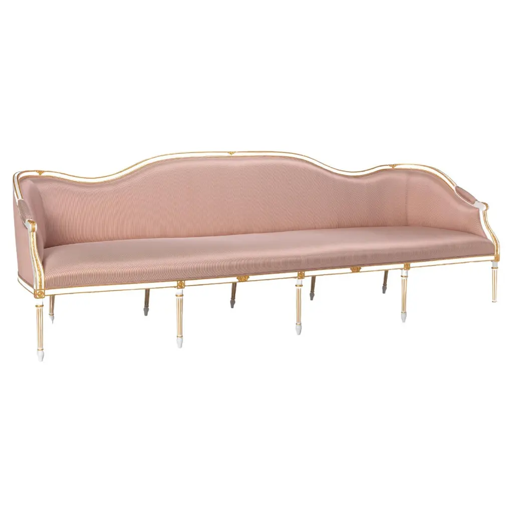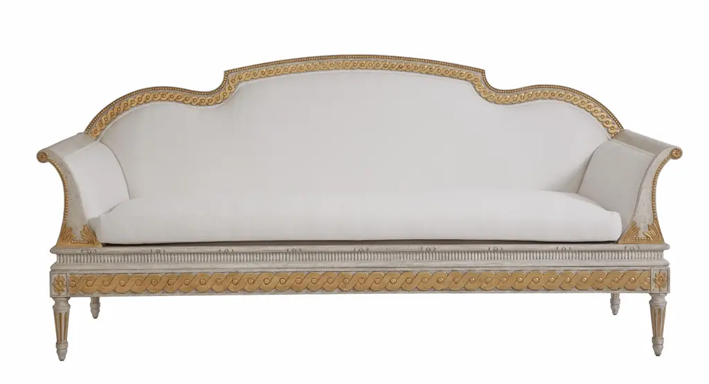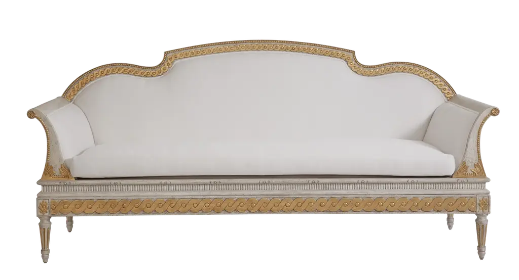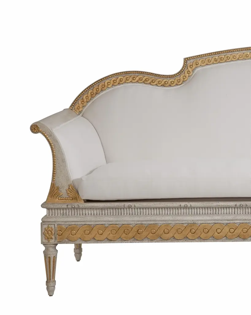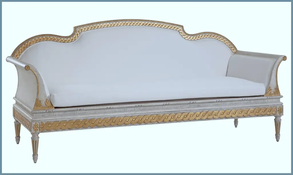 Swedish Gustavian Guilloche [running coin] Hand Carved Exposed Frame Sofa Made by Swede Collection, SC0041 Entirely hand carved detail on all rims, seat trim, top of inside back and legs. Made of American Maple. Height: 40" Overall Length: 85" Inside Length of Cushion: 68" Overall Depth: 33" Inside Seat Depth: 24" Finish: Textured Pale Gray with hand applied Italian Gold Leaf. Upholstered in 12 Yards of white acrylic performance fabric that is soap/water cleanable. Please note we do not ship to California, Nevada, Utah, Washington or Oregon with our internal shipping department. If you live in those states, shipping will be done by Chairish.
