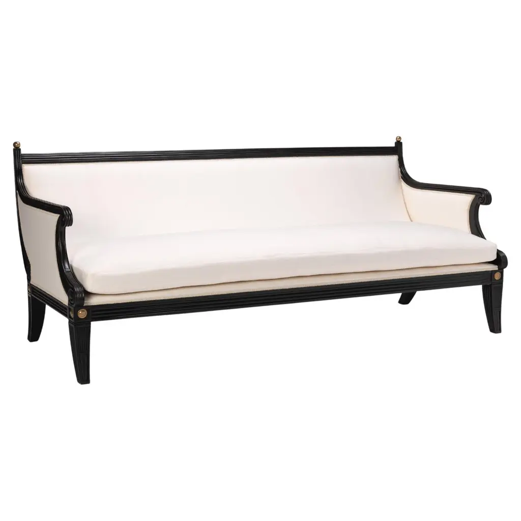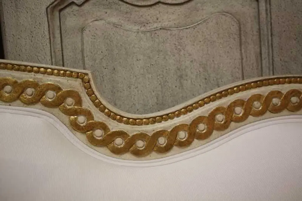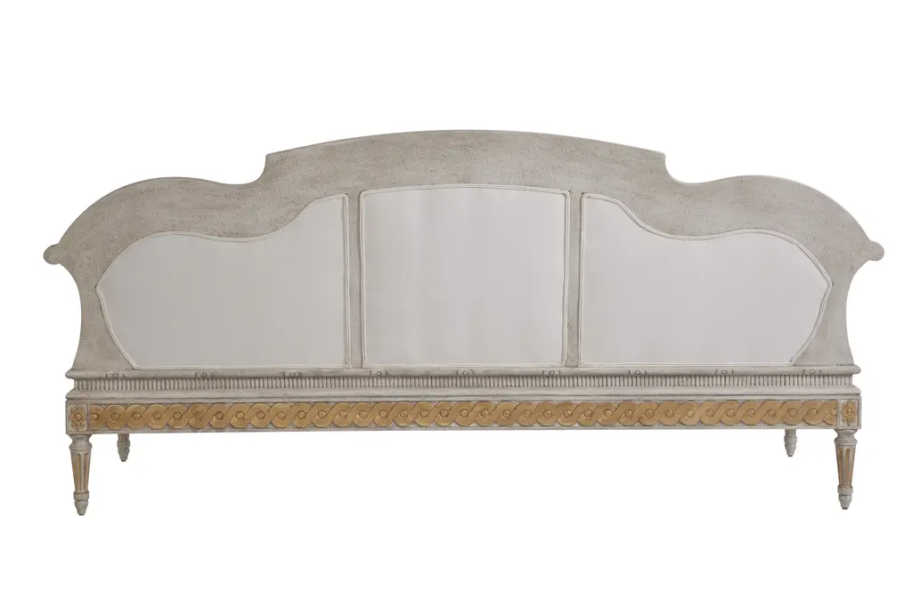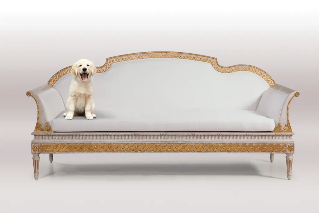 Swedish Gustavian Guilloche [running coin] Hand Carved Exposed Frame Sofa Made by Swede Collection, SC0041 Entirely hand carved detail on all rims, seat trim, top of inside back and legs. Made of American Maple. Height: 40" Overall Length: 85" Inside Length of Cushion: 68" Overall Depth: 33" Inside Seat Depth: 24" Finish: Textured Pale Gray with hand applied Italian Gold Leaf. Upholstered in 12 Yards of white acrylic performance fabric that is soap/water cleanable. Please note we do not ship to California, Nevada, Utah, Washington or Oregon with our internal shipping department. If you live in those states, shipping will be done by Chairish.