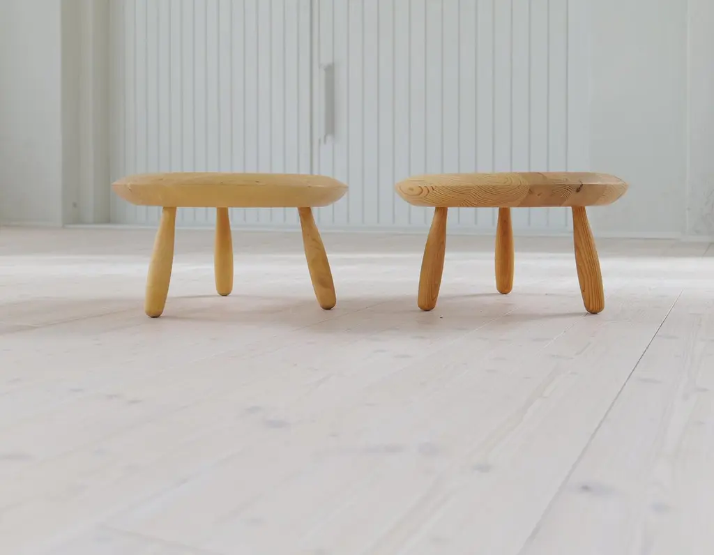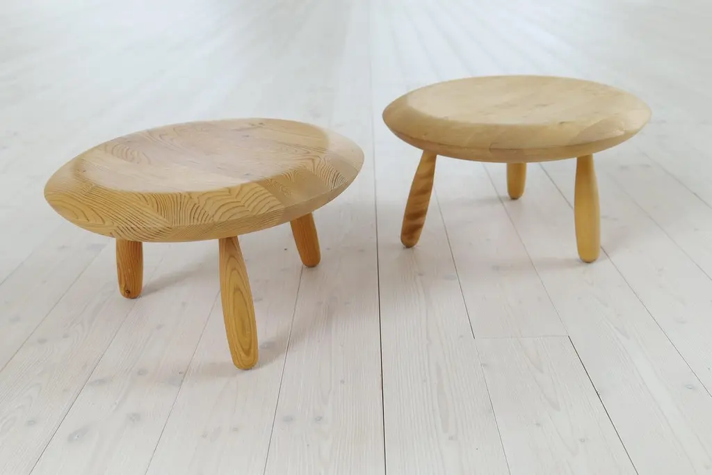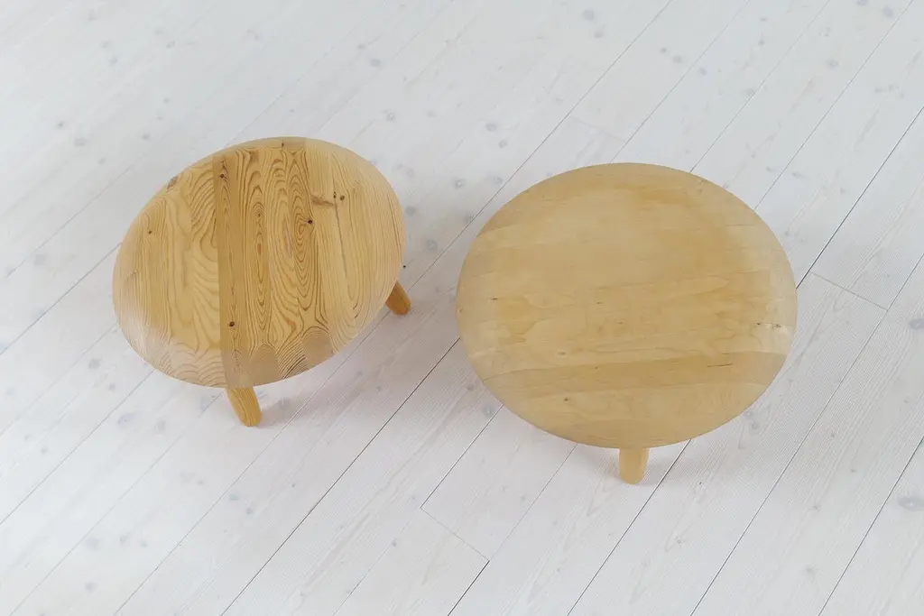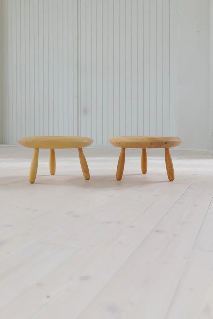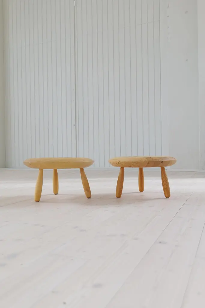 As a pair these iconic stools are a great edition to any home decor. They have clumsy mushroomy but still sophisticated look. Made in massive birch they are quite heavy but still easy to move around and create a good look, but also a great small table.Good vintage design with wear and some marks. Dimensions Height 27 width 47