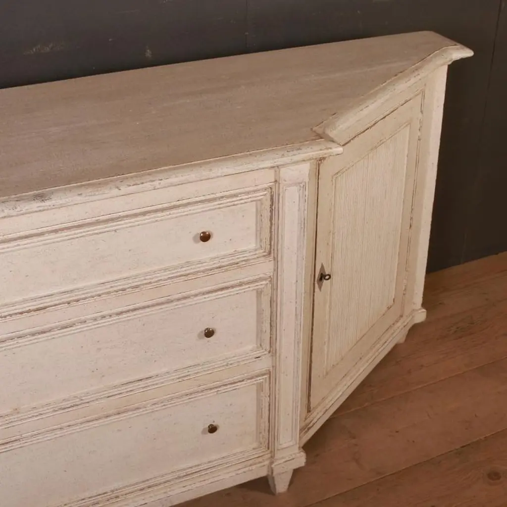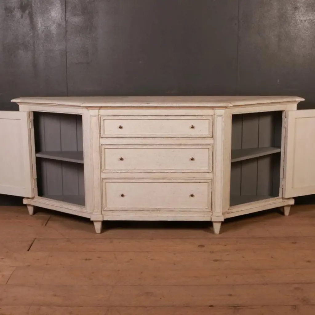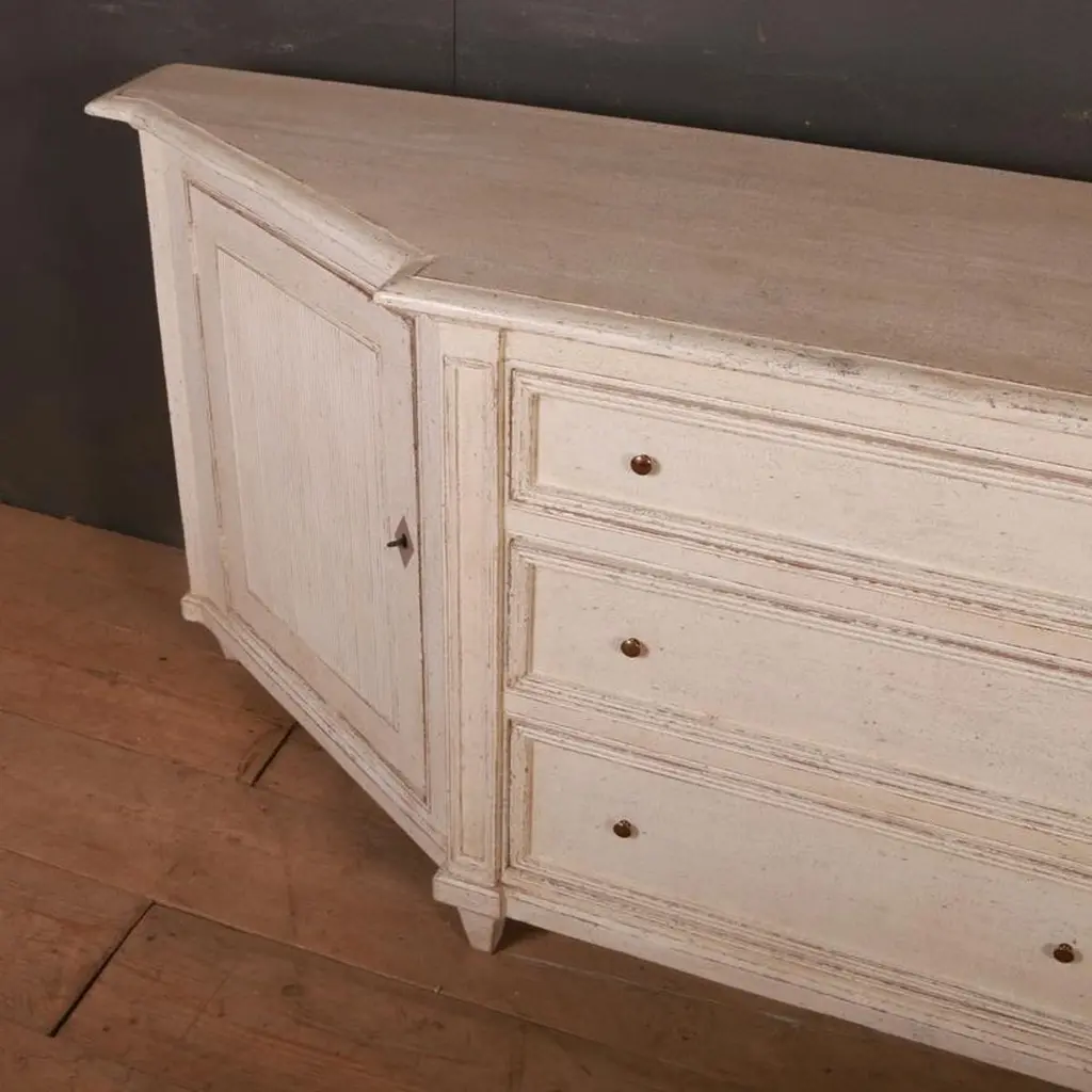 Custom made Swedish style enfilade with 3 drawers and canted cupboards. This can be made to your size and paint color.Dimensions:77 inches (196 cms) wide19.5 inches (50 cms) deep33 inches (84 cms) high.