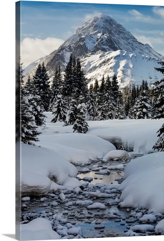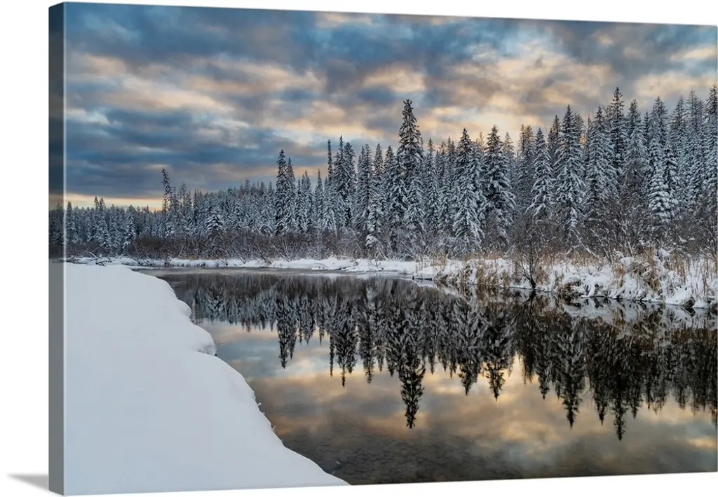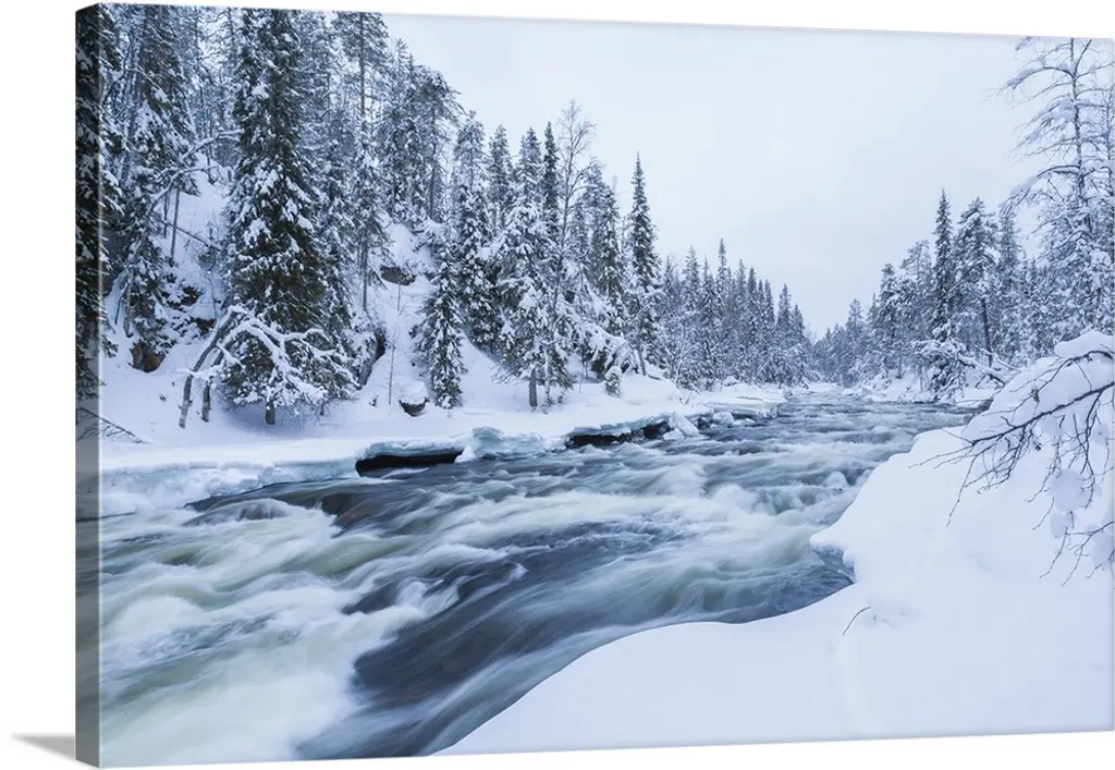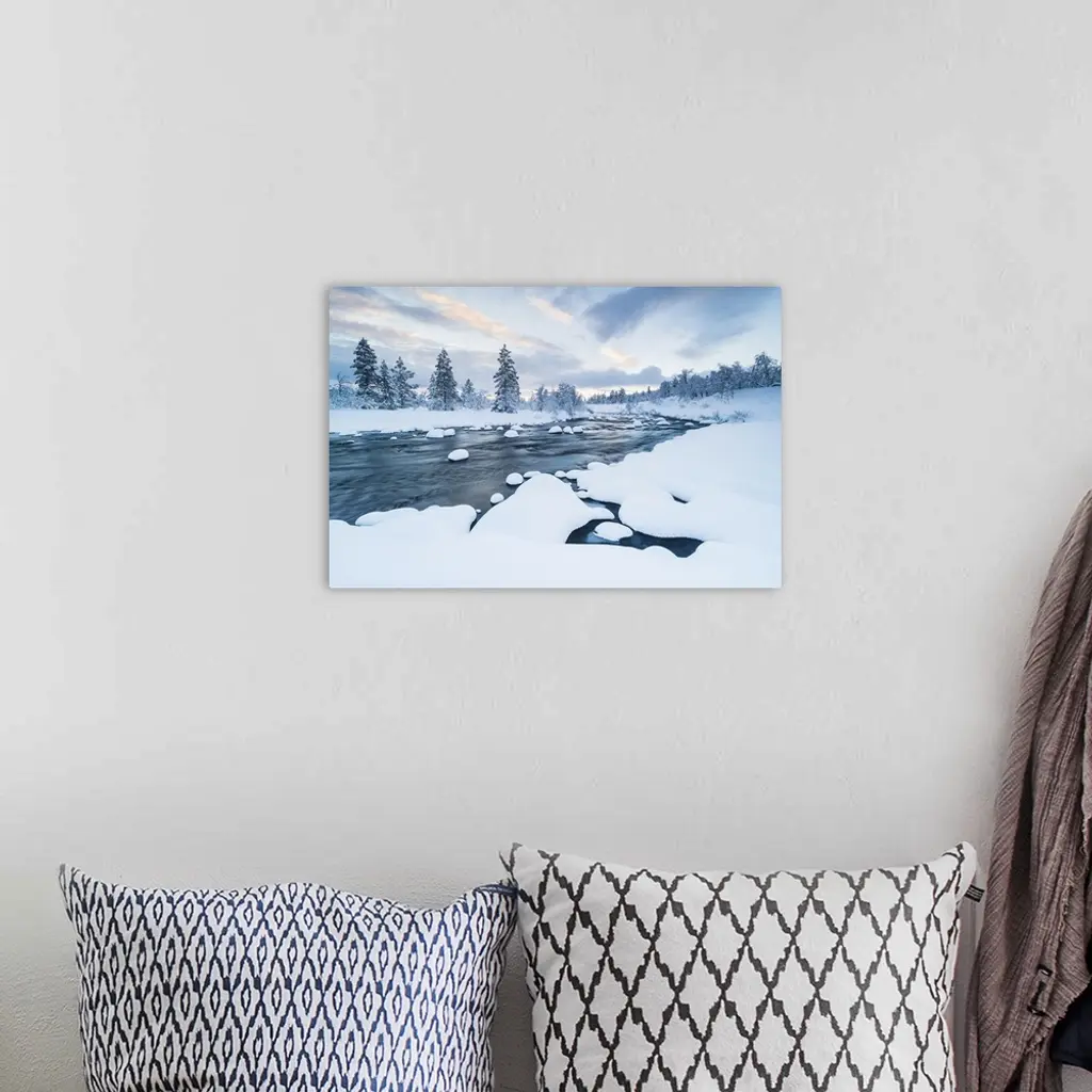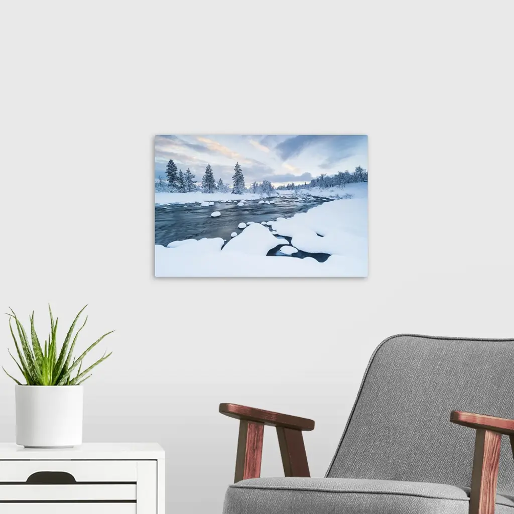 The river with snow in it and a forest near covered with snow in winter in Sweden.