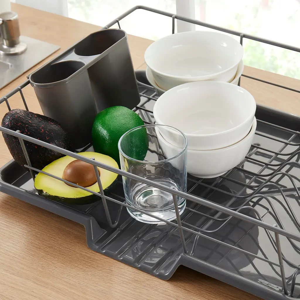 This three-piece dish drainer comes with a moisture tray for quick draining into an adjacent sink. This set also features dish and cup slots and a plastic caddie for cutlery for optimal drying and capacity purposes.