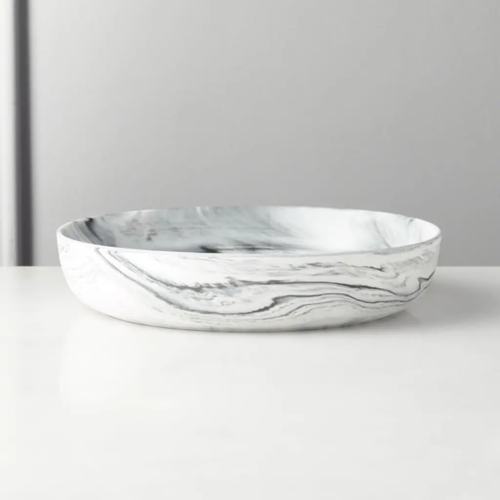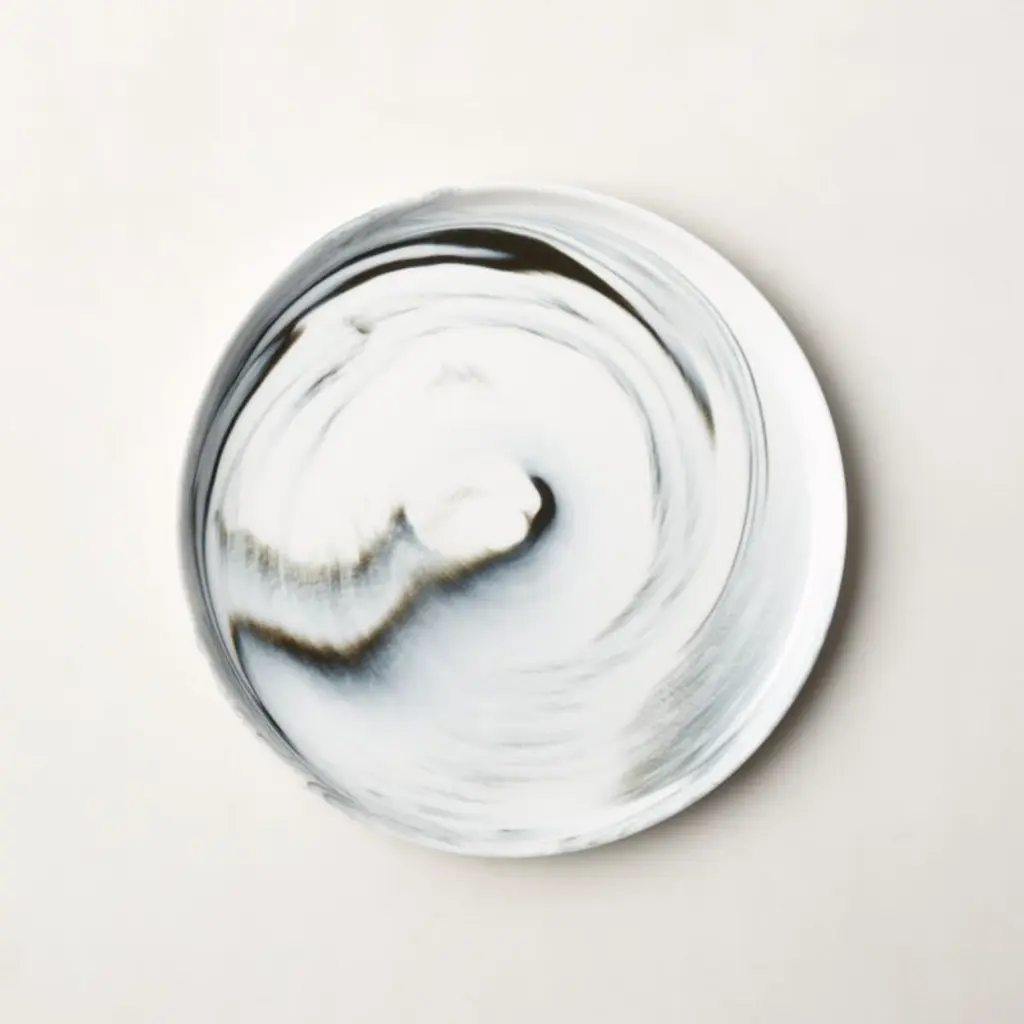 Raw porcelain mixed with color clay swirls to create black-and-white dinnerware inspired by designer Jennifer Fisher's favorite salad bowl at home. The end result is a unique marbleized effect that feels special and sophisticated but works for everyday. "I wanted something graphic that matched the rest of the collection, but with a neutral edge," says Fisher. "If you don't want to choose black or white, these are perfect. They're not too dark, they're not too light; they're just right." CB2 exclusive.
