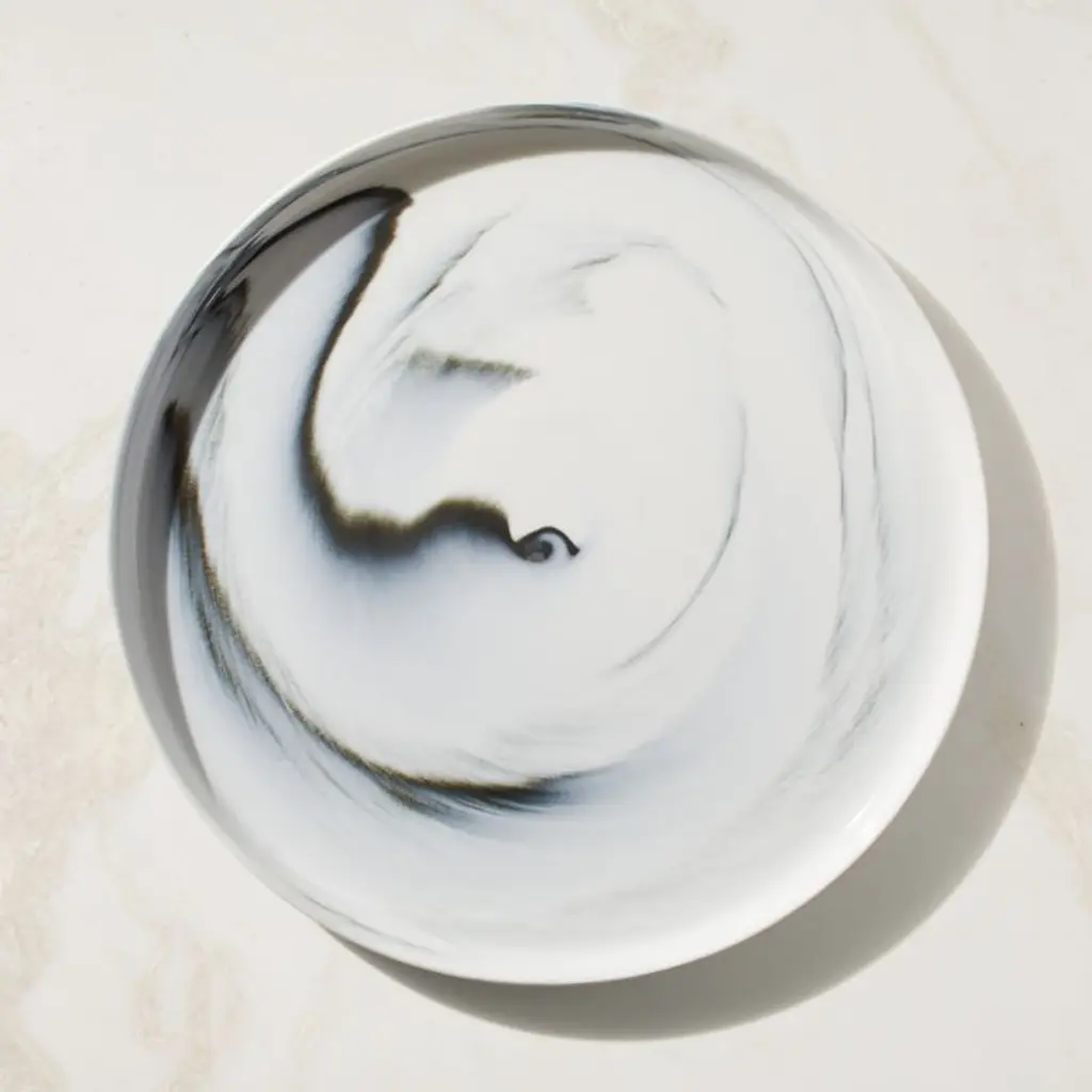 Raw porcelain mixed with color clay swirls to create a black-and-white salad plate inspired by designer Jennifer Fisher's favorite salad bowl at home. The end result is a unique marbleized effect that feels special and sophisticated but works for everyday. "I wanted something graphic that matched the rest of the collection, but with a neutral edge," says Jennifer Fisher. "If you don't want to choose black or white, these are perfect. They're not too dark, they're not too light; they're just right." CB2 exclusive.