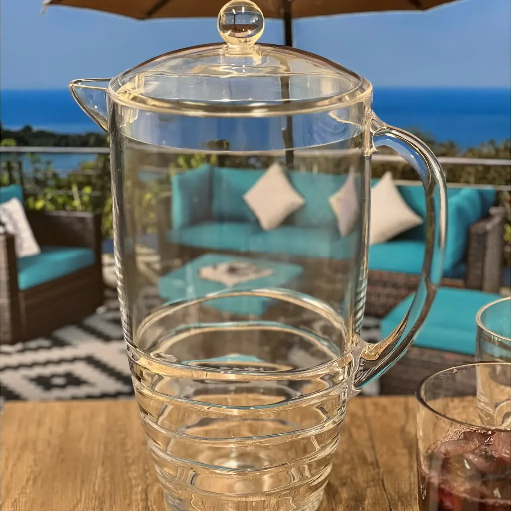 Tired of constantly improvising when it comes to serving your delicious homemade lemonade or margarita or do you want to impress your guests with a refreshing beverage? If so, then this drink pitcher is the perfect choice for you!. This water pitcher with lid is break resistant, meaning you don't have to worry about messy accidents or replacing a broken pitcher. Impress your guests and elevate your entertaining game to the next level with our unbreakable diamond-cut plastic pitcher with lid.. This stylish and crystal-clear juice pitcher with spout is made from high-quality, BPA-free durable material that is built to last. It features a unique diamond-cut design that is sure to catch the eye of your guests and add a touch of elegance to any occasion.. This drink pitcher has a generous capacity of 2.5 Quarts, so you'll have plenty of room to mix up your favorite drinks. And with its convenient handle and spout, it's easy to pour and serve your beverages with ease.. Whether you're hosting a backyard barbecue, a pool party, or just enjoying a warm summer evening on the patio, this drink pitcher is sure to become your go-to choice for serving up delicious and refreshing beverages. So, get this drink pitcher today and elevate your entertaining game to the next level!. Inside and Outside Friendly. Crystal Clear looks similar to glass