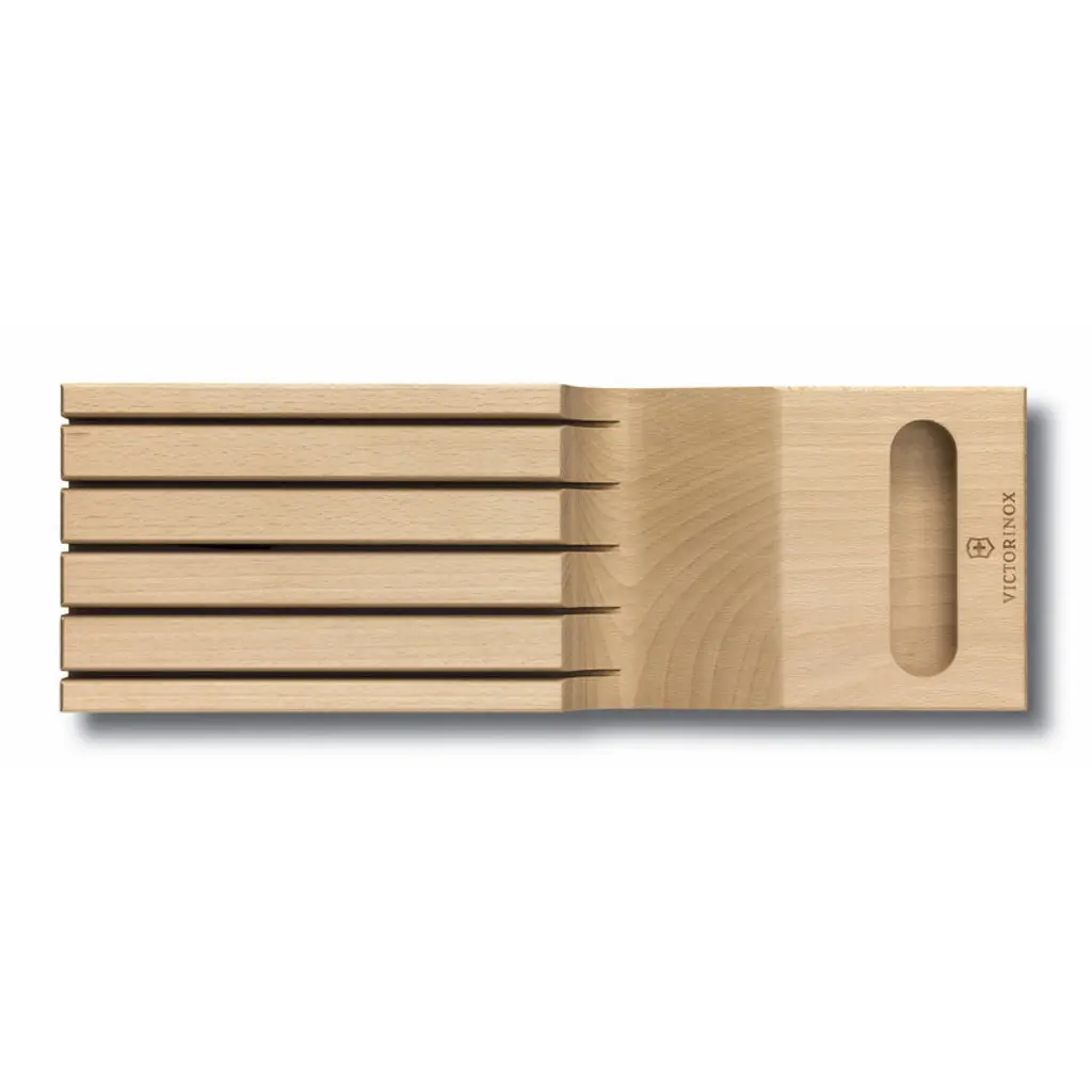 Victorinox's Swiss Classic in-drawer knife holder keeps your kitchen knives protected and sharp while freeing up valuable counter space for what really matters: cooking! Designed to fit neatly inside a kitchen drawer, the horizontal holder keeps your most-used knives close at hand and smartly out of sight. Made of beech wood, the Swiss Classic holder has space for up to five knives. Please note that this product includes the knife holder only and the knives are yours to choose.