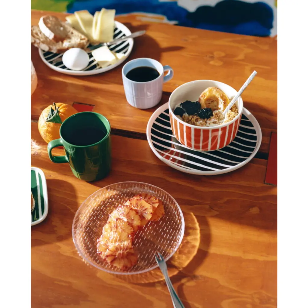 Marimekko’s Syksy plates are adorned with a beautifully designed relief surface by Matti Klenell, featuring subtle lines that evoke the various shapes of rustling autumn rain. Named after the Finnish word for autumn, the Syksy glassware continues Marimekko’s longstanding tradition of interpreting the moods of nature and weather phenomena. Crafted from mouth-blown glass, the series exhibits a delicately sketch-like texture that skillfully brings to life the refreshing feeling of rain. Sold in a set of two, the Syksy plates are perfect for serving both everyday snacks as well as festive treats.
