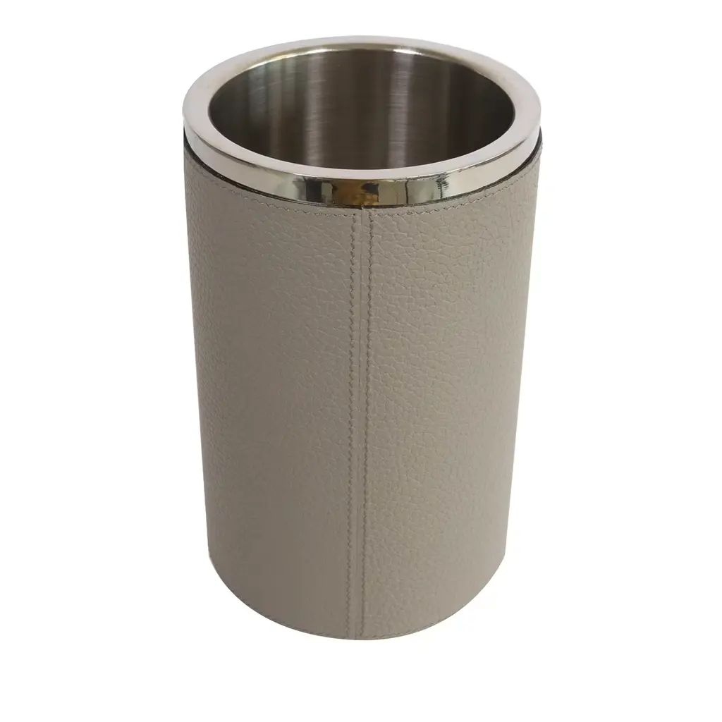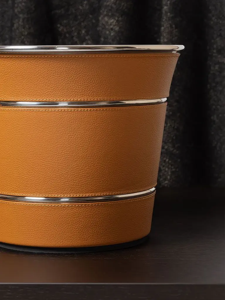 The champagne bucket designed by Giobagnara for Poltrona Frau is a rimmed steel container adorned with three elegant outer bands in Pelle Frau® leather, available in a variety of colors. It comes in a range of sizes that can hold from one to about five bottles. The bottle cooler can be either freestanding or placed on the special stand.The Tableware Collection, created in cobranding with Giobagnara, is a family of coordinated dining table accessories, designed to add a sophisticated and precious touch to even the simplest dinner party. The collection offers a wide range of elegant and practical elements to enrich the social gathering, all upholstered in Pelle Frau® leather and meticulously handcrafted down to the finest of details. The Tableware Collection accessories evoke a warm and inviting atmosphere and a spirit of hospitality, reflecting thoughtfulness and consideration for others, enhancing the pleasure of every dining experience.