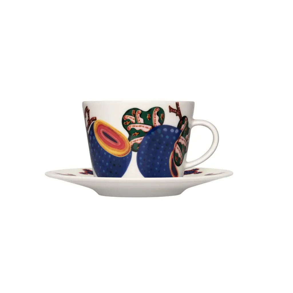 The Taika Sato cappuccino cup from Iittala is decorated with a design by Klaus Haapaniemi, inspired by harvest time and Haapaniemi's own garden. A matching saucer is available separately. In the Taika Sato series, introduced in 2024, Finnish artist Klaus Haapaniemi interprets garden fruits and vegetables in his distinctively rich and detailed style. The shapes and colors are intentionally abstract, leaving room for interpretation. In addition to his own garden, Haapaniemi drew inspiration for the illustrations from still-life art and botanical drawings, which adds a further layer of ambiguity to the designs. Instead of repetitive patterns, each item in the series is a unique individual, yet they fascinatingly complement each other. Named after two Finnish nouns, 'magic' and 'harvest', Taika Sato is sure to add a touch of harvest charm to all of your table settings.