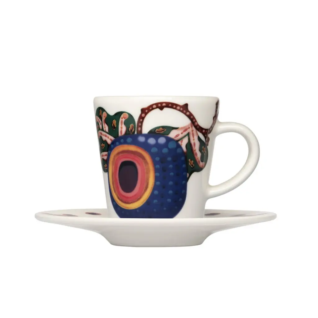 The Taika Sato espresso cup from Iittala is decorated with a design by Klaus Haapaniemi, inspired by harvest time and Haapaniemi's own garden. A matching saucer is available separately. In the Taika Sato series, introduced in 2024, Finnish artist Klaus Haapaniemi interprets garden fruits and vegetables in his distinctively rich and detailed style. The shapes and colors are intentionally abstract, leaving room for interpretation. In addition to his own garden, Haapaniemi drew inspiration for the illustrations from still-life art and botanical drawings, which adds a further layer of ambiguity to the designs. Instead of repetitive patterns, each item in the series is a unique individual, yet they fascinatingly complement each other. Named after two Finnish nouns, 'magic' and 'harvest', Taika Sato is sure to add a touch of harvest charm to all of your table settings.