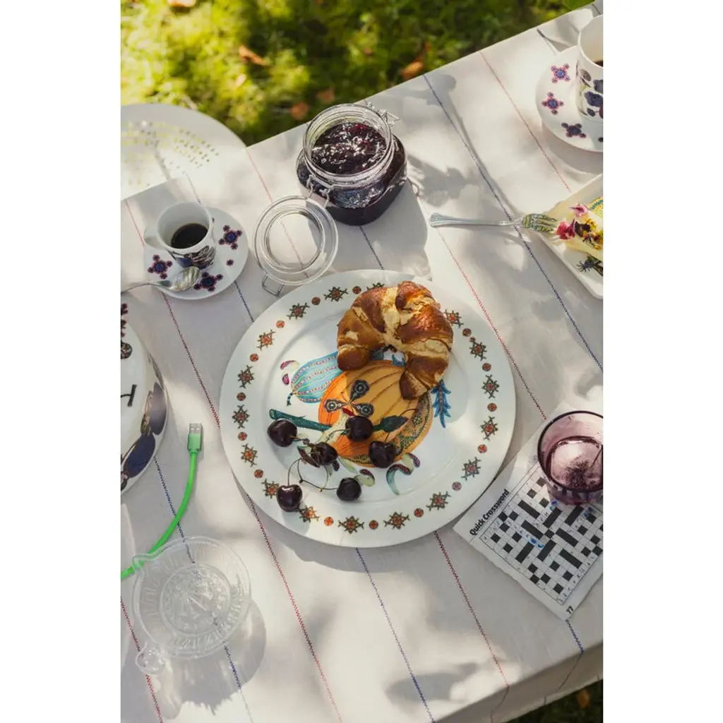 The Taika Sato plate from Iittala is decorated with a design by Klaus Haapaniemi, inspired by harvest time and Haapaniemi's own garden. Thanks to the lovely illustration, the plate can be used in both everyday and festive table settings – we recommend it for starters, desserts or breakfast. In the Taika Sato series, introduced in 2024, Finnish artist Klaus Haapaniemi interprets garden fruits and vegetables in his distinctively rich and detailed style. The shapes and colors are intentionally abstract, leaving room for interpretation. In addition to his own garden, Haapaniemi drew inspiration for the illustrations from still-life art and botanical drawings, which adds a further layer of ambiguity to the designs. Instead of repetitive patterns, each item in the series is a unique individual, yet they fascinatingly complement each other. Named after two Finnish nouns, 'magic' and 'harvest', Taika Sato is sure to add a touch of harvest charm to all of your table settings.