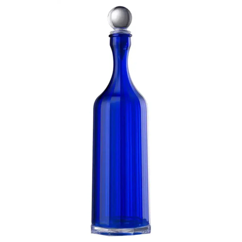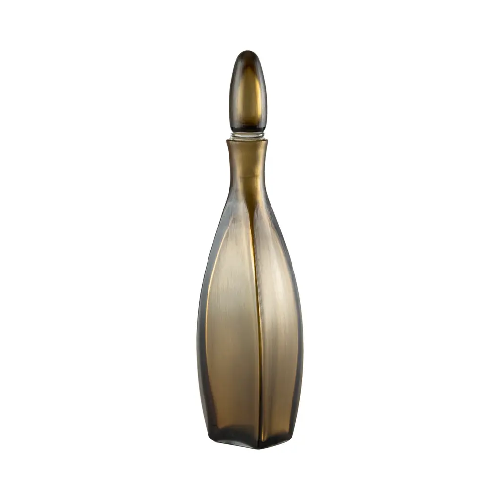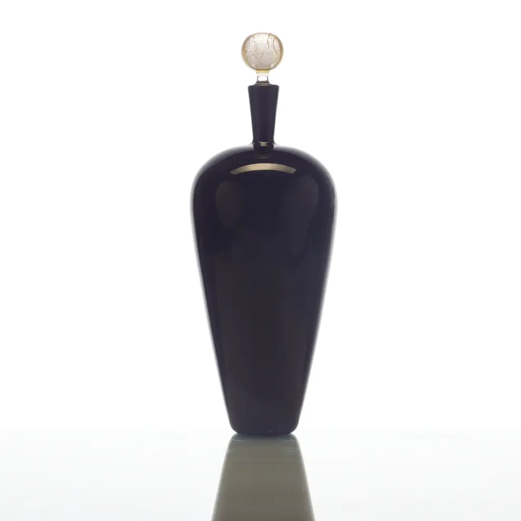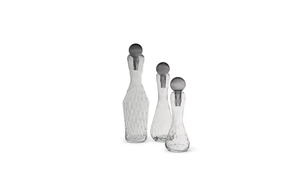 Carafe with blown and embossed glass container and smooth glass stopper. Manufactured in Europe