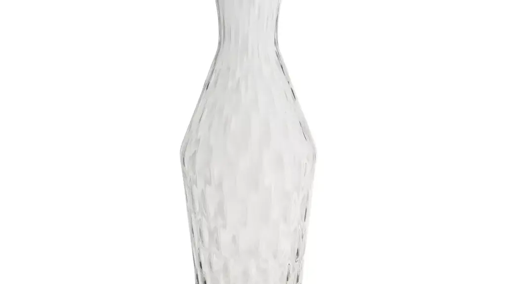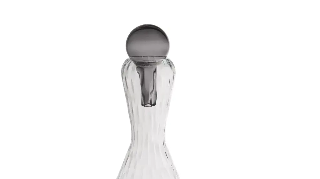 Carafe with blown and embossed glass container and smooth glass stopper. Manufactured in Europe