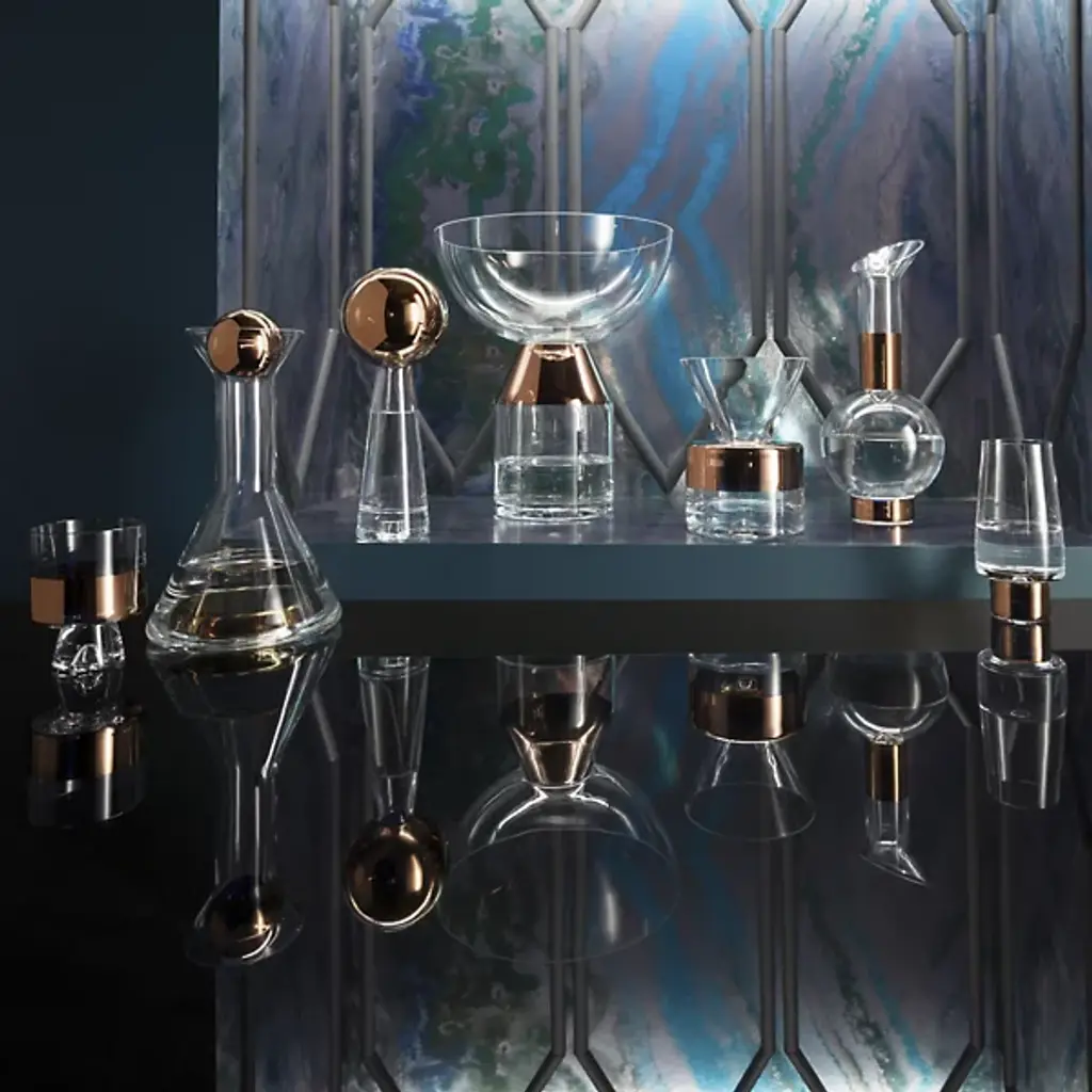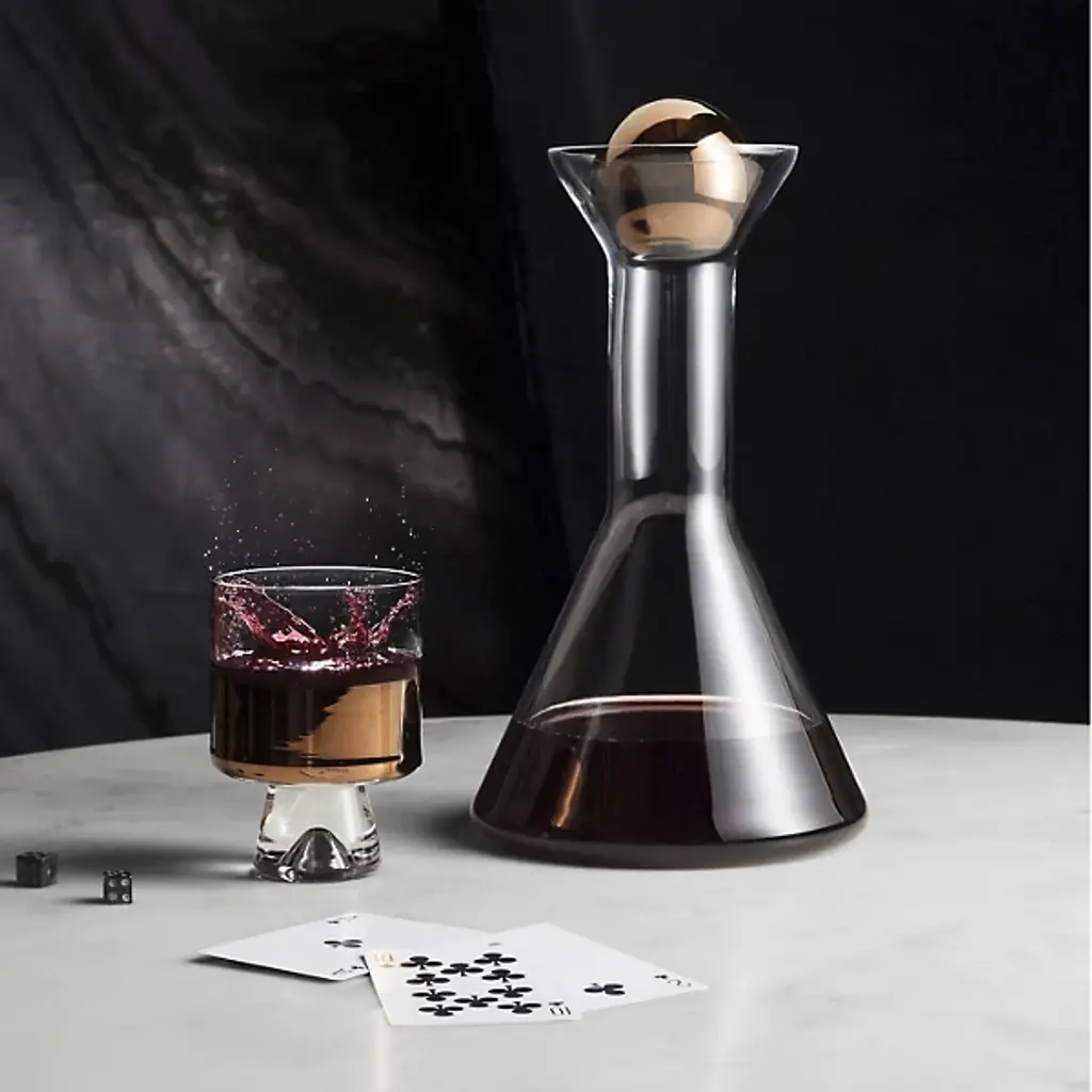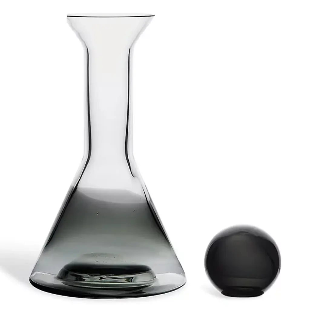 Beautiful proportions and eye-catching copper accents ensure that the Tom Dixon Tank Decanter will be on permanent display in the home--whether it's filled with your favorite wine or not. The angular piece is made out of clear mouth-blown glass, with the round stopper and raised portion of the base hand painted with gleaming copper.