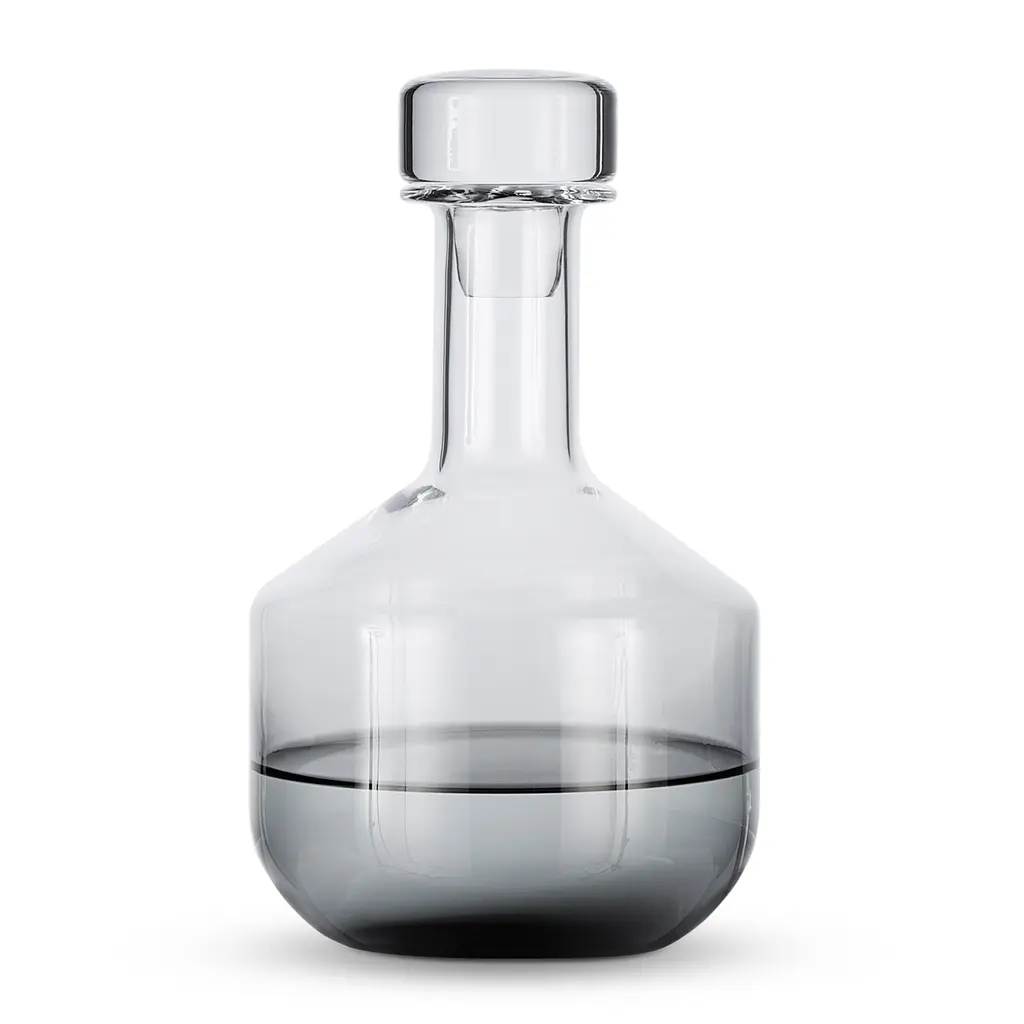 Meet the decanter that will make your favorite whiskey even more enjoyable than before. An elegant version of the popular Tank collection, the Tank Whiskey Decanter Black features the same striking silhouette that references lab glassware, but in a darker form. Expertly handmade, the decanter boasts a blend of opaque black and clear glass, fused together through a complex process. As a result, each decanter is one-of-a-kind. The color may also change over time and with use. The Tom Dixon Tank Whiskey Decanter has a capacity of 1 L. Since the Tank collection is not dishwasher-safe, this decanter should be hand-washed only. Matching glasses are also available, along with copper versions of the Tank design.