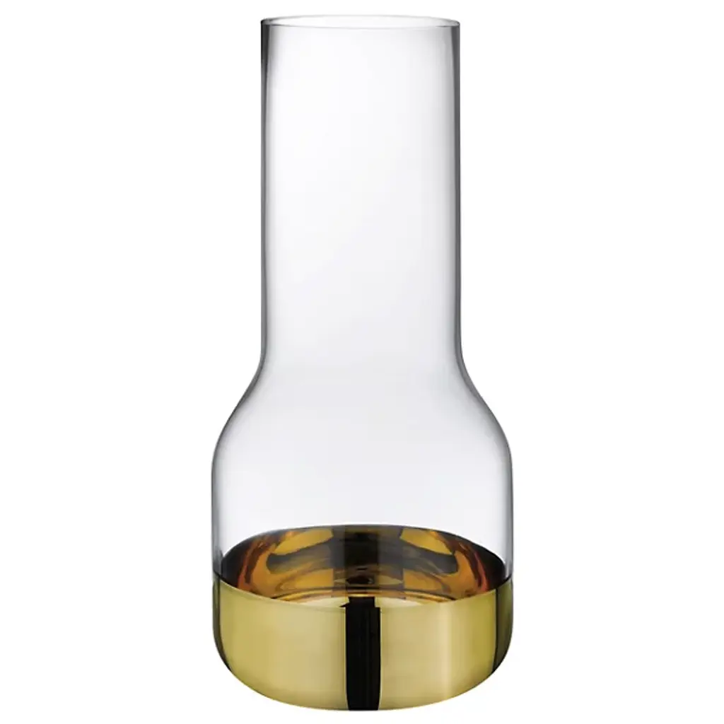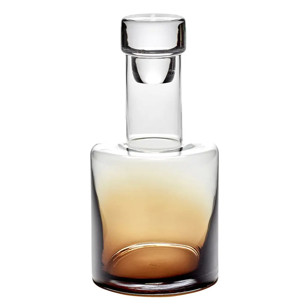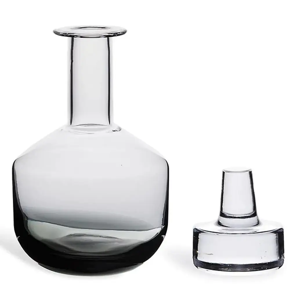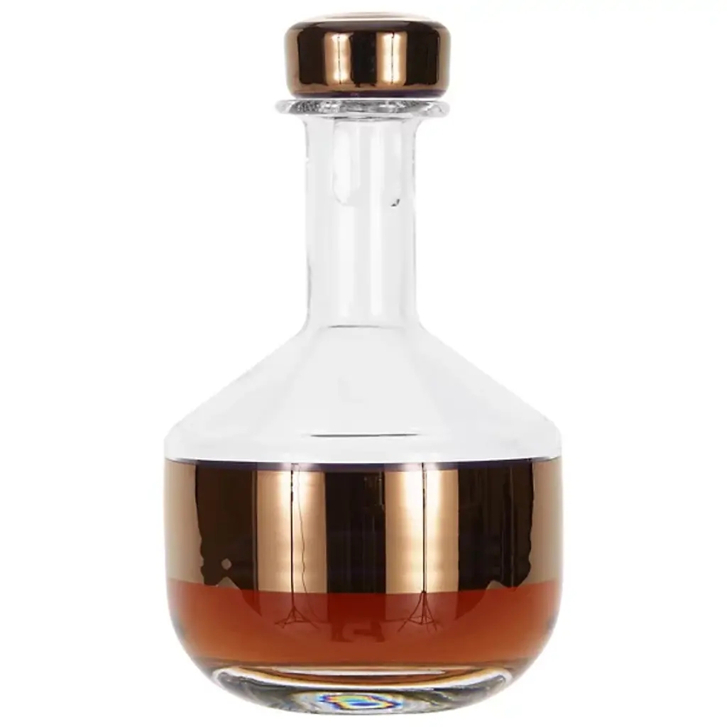 A sturdy and stout decanter with a bit of flashy glamour. The Tom Dixon Tank Whiskey Decanter is made entirely out of clear mouth blown glass with shiny hand-painted copper accents. The warm tone of the copper is the perfect complement to the warm brown liquid that you'll keep in the decanter.