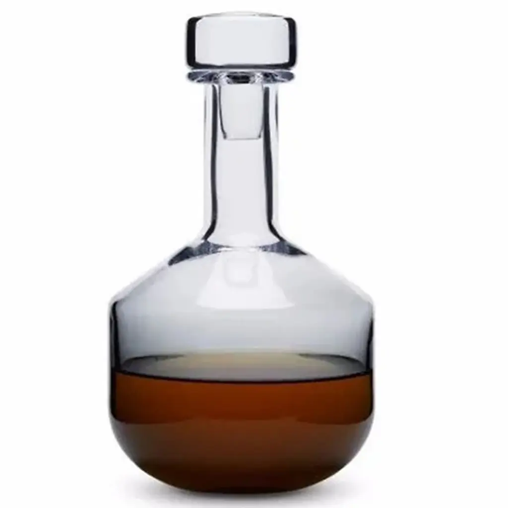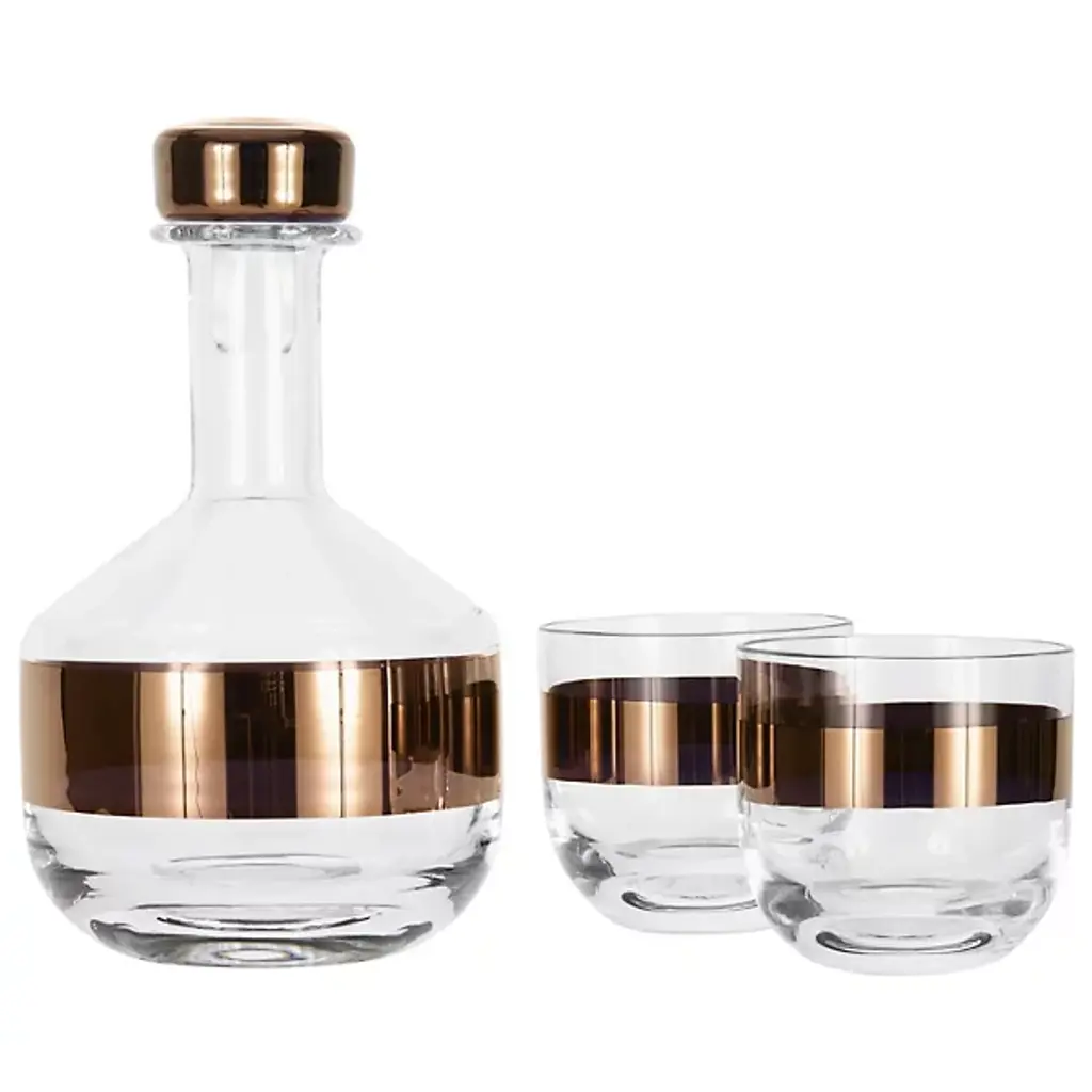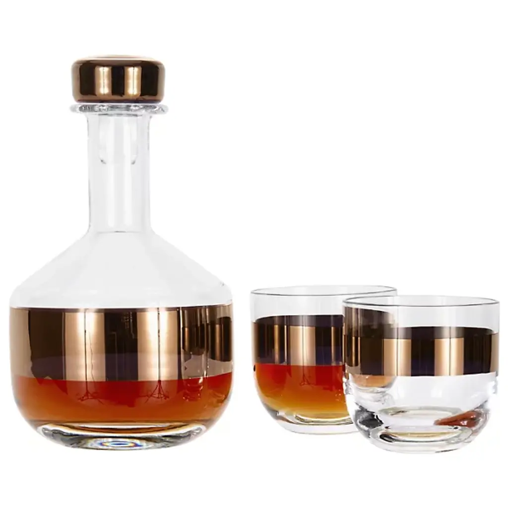 A sturdy and stout decanter with a bit of flashy glamour. The Tom Dixon Tank Whiskey Decanter is made entirely out of clear mouth blown glass with shiny hand-painted copper accents. The warm tone of the copper is the perfect complement to the warm brown liquid that you'll keep in the decanter.