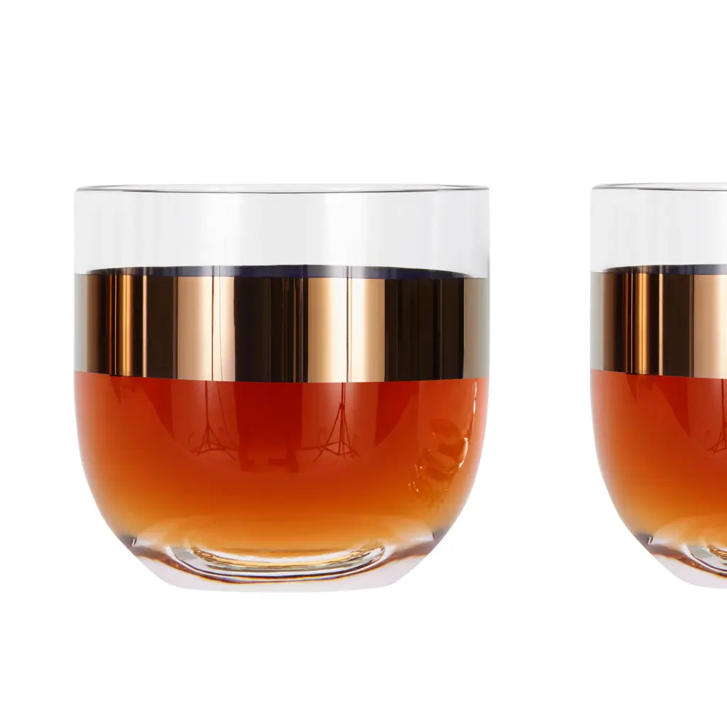 An elegant gift for a whiskey lover who also appreciates contemporary design. Part of the Tank Copper line made by Tom Dixon, the Tank Whiskey Glasses Copper have a minimalist but decorative appearance. The shape of the glass reminds of scientific glassware, while the hand-painted copper detailing adds a chic accent to the design. Like all of the other Tank Copper products, the glasses are made from mouth-blown glass. This set of two whiskey glasses comes in a stylish gift box. Complement the set with the whiskey decanter from the same line or create a sophisticated home bar with the other products from the Tank collection.