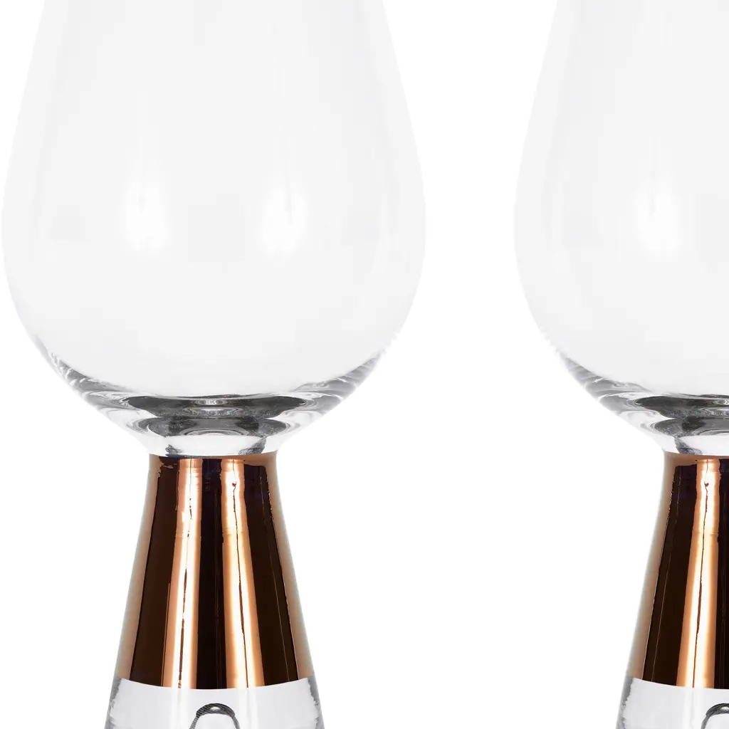 Enhance your wine drinking experience with glasses that add a visual dimension to complex tasting notes. Perfect for your finest wine, the Tank Wine Glasses Copper feature a refined design. The Tom Dixon Tank collection draws inspiration from scientific glassware. In this version, a copper color enhances the line’s elegant silhouettes. Bold and eye-catching, these glasses have a wider base and a chunky stem. The classic tulip shape maximizes the enjoyment of wine. In a similar way to the other products from the Tank Copper collection, every wine glass boasts hand-painted copper detailing. This set comes with two wine glasses and gift-ready packaging. A matching wine decanter along with other barware from the Tom Dixon line are also available.