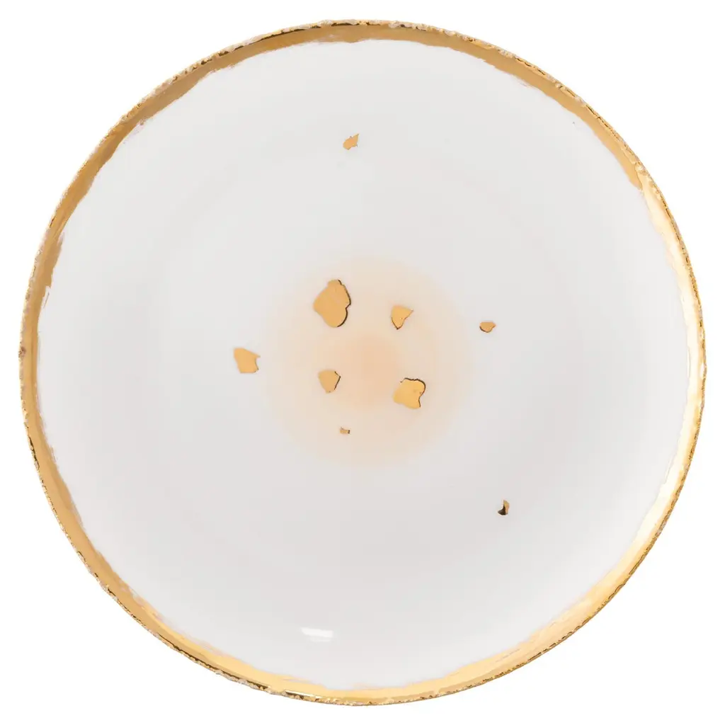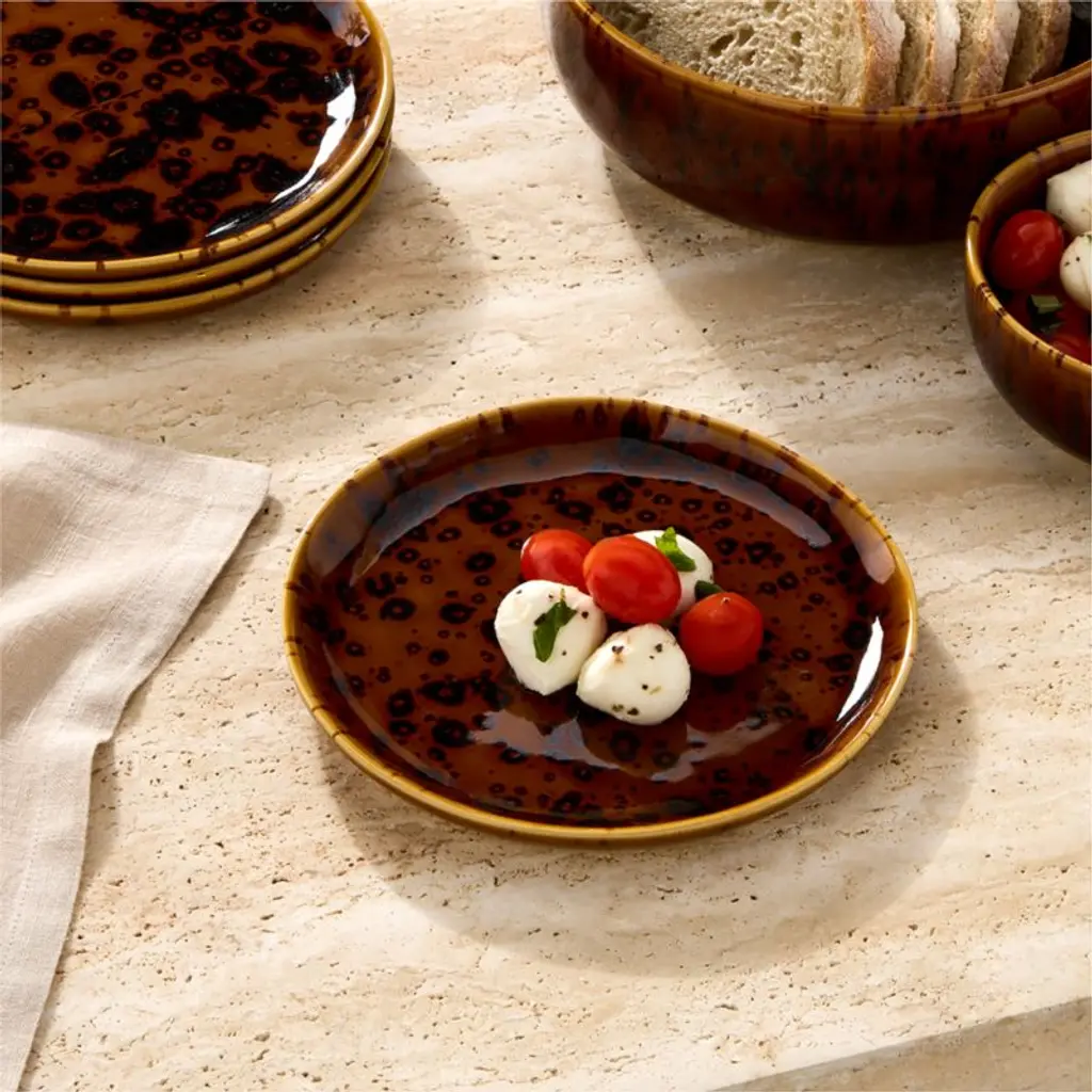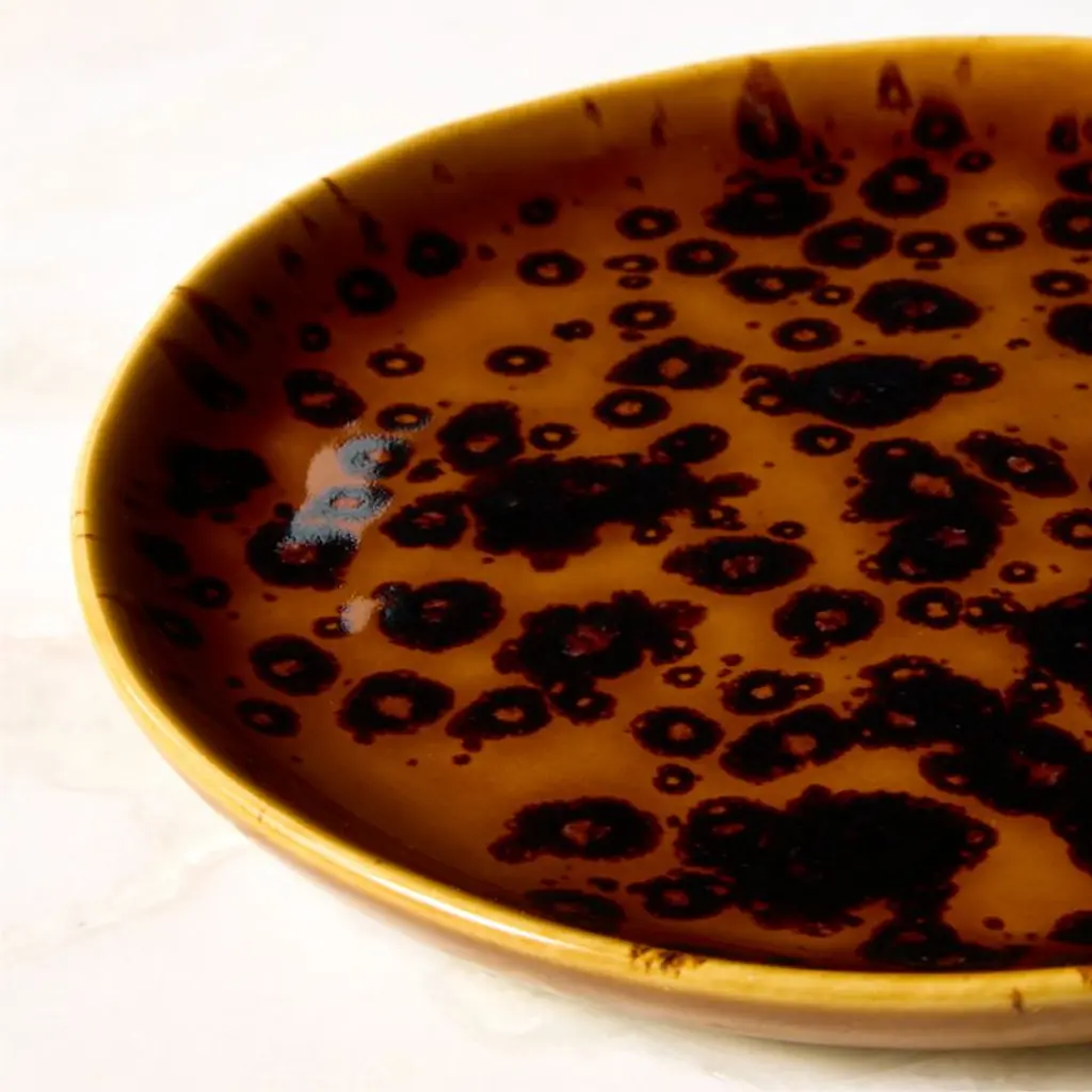 Hand-finished by Portuguese artisans, stoneware appetizer plate brings a pop of pattern to the table. Each plate is carefully molded with a clean, modern silhouette to showcase the rich reactive glaze. Black spots burst and bloom across the stoneware, creating a unique pattern that reminds us of leopard print. CB2 exclusive.