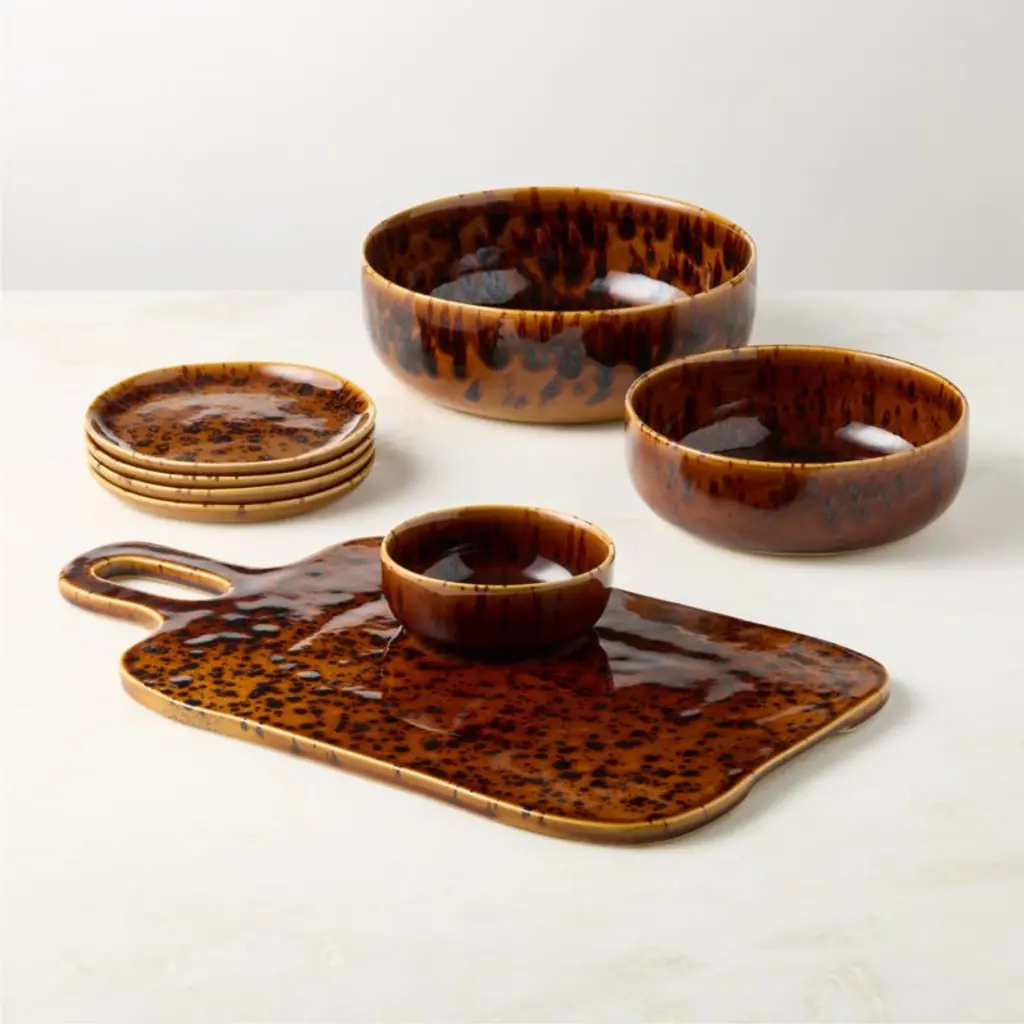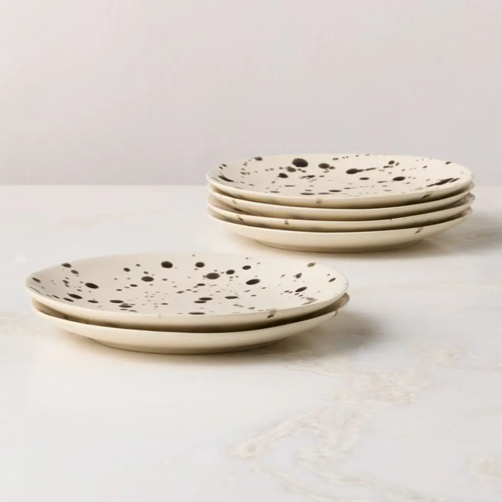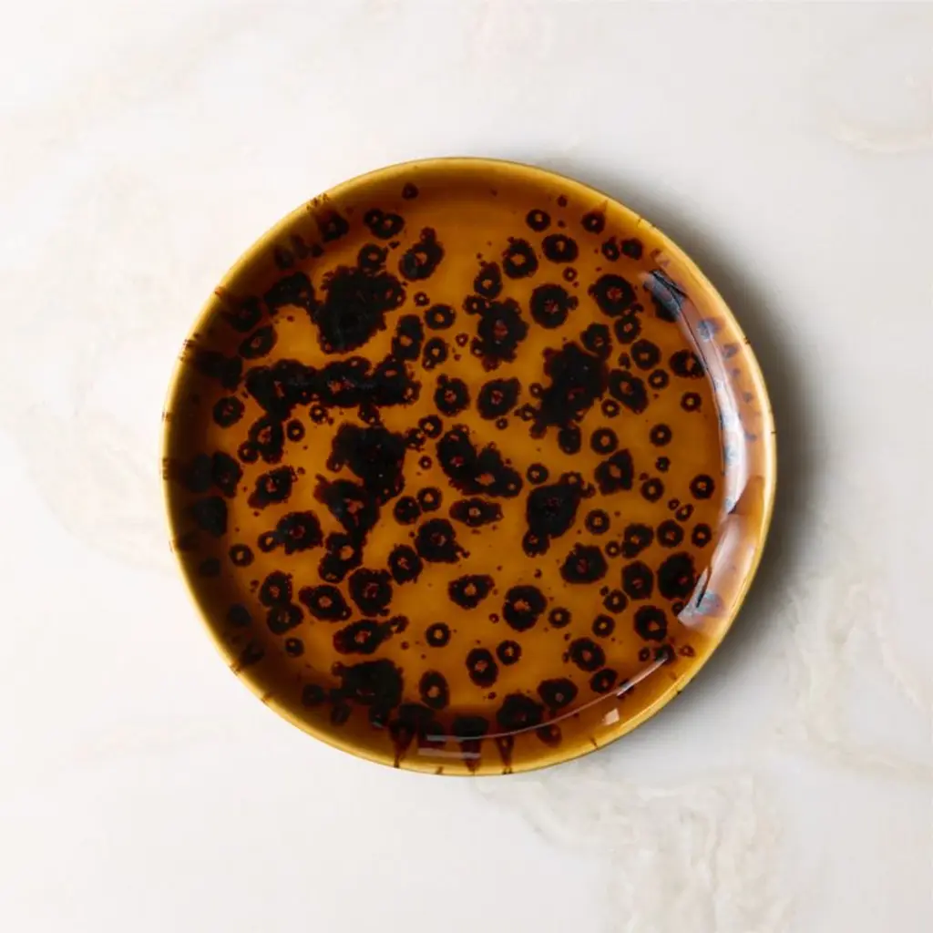 Hand-finished by Portuguese artisans, stoneware appetizer plates bring a pop of pattern to the table. Each plate is carefully molded with a clean, modern silhouette to showcase the rich reactive glaze. Black spots burst and bloom across the stoneware, creating a unique pattern that reminds us of leopard print. CB2 exclusive.