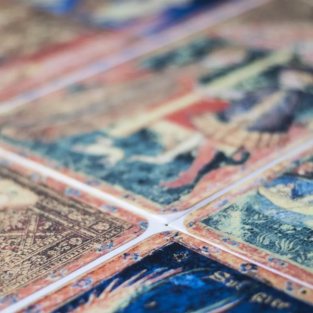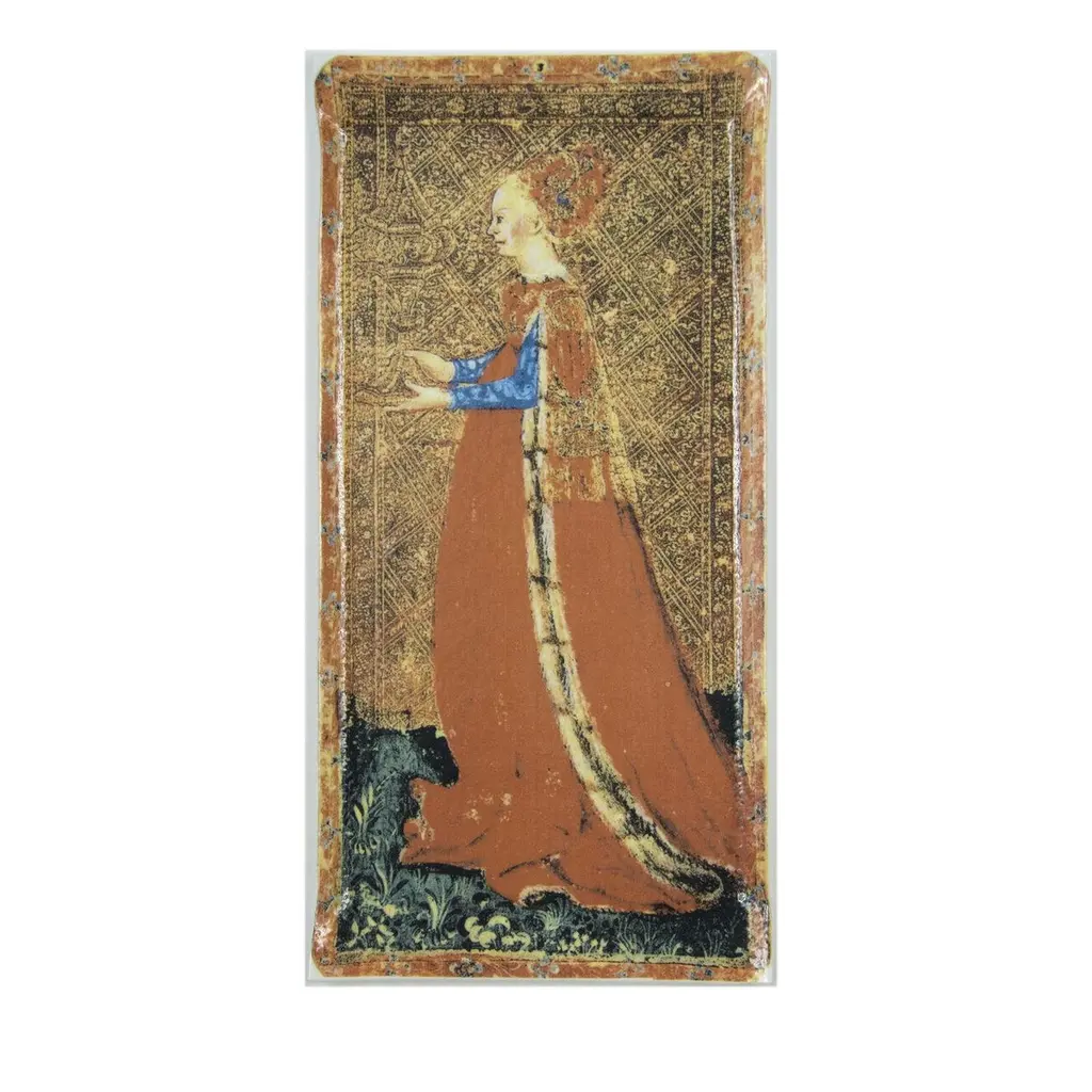 Stunning in its simplicity, this Murano glass replica of the medieval tarot card by the Visconti di Modrone will transform any decor with its antique allure. The Queen of Cups, a poetic indicator of a loving master, is represented as an omniscient woman, depicted walking in a verdant landscape wearing lavish red dress with turquoise and gold accents and her curly blonde hair gathered in a red headscarf. Her light skin shines against the gold background. A call to empathy and love, this card is a powerful reminder to love oneself and others in equal measure and will make an excellent gift. Designed by Paolo Maria Russo for Vetrofuso-Daniela Poletti