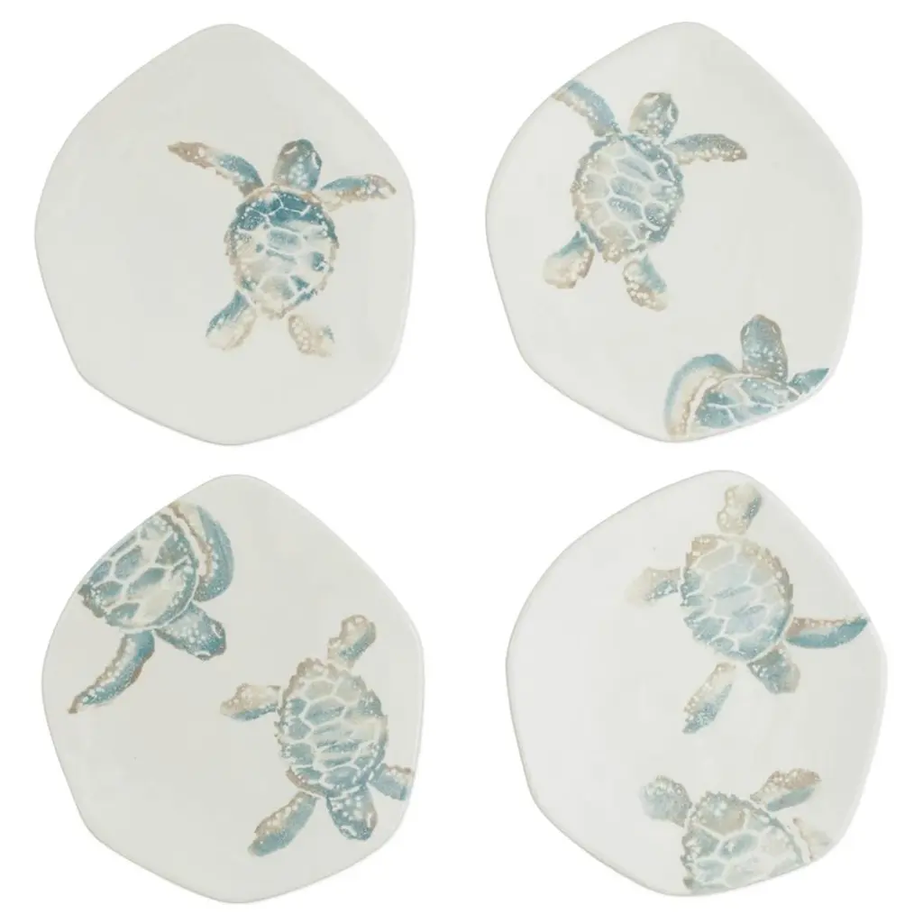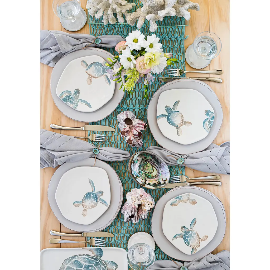 Handpainted sea turtles, rendered in soft hues of aqua and taupe, decorate the white surfaces of VIETRI's Tartaruga Dinnerware collection. Maestro artisan Gianluca Fabbro utilized a unique sponging technique to carefully add detail to each earthenware piece.