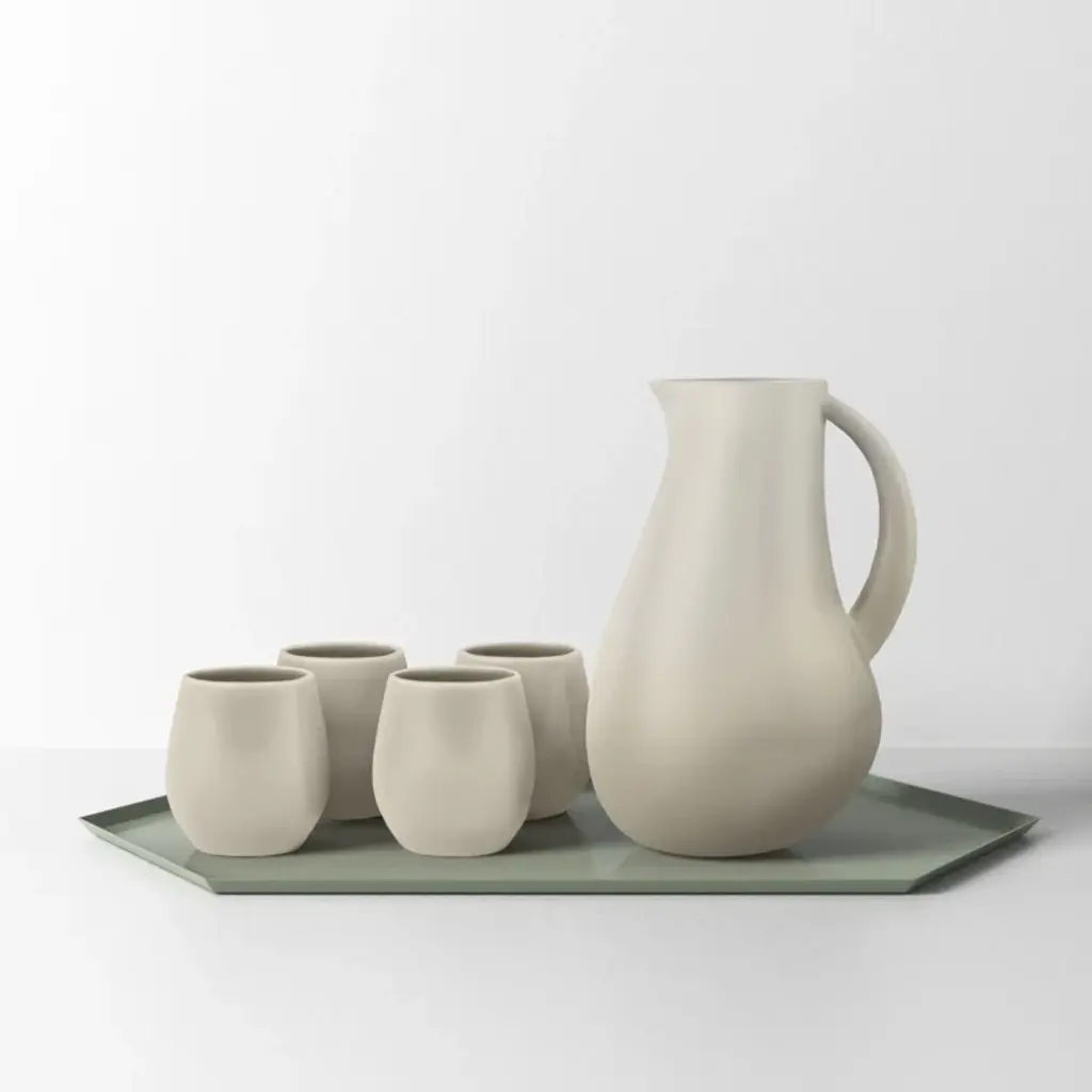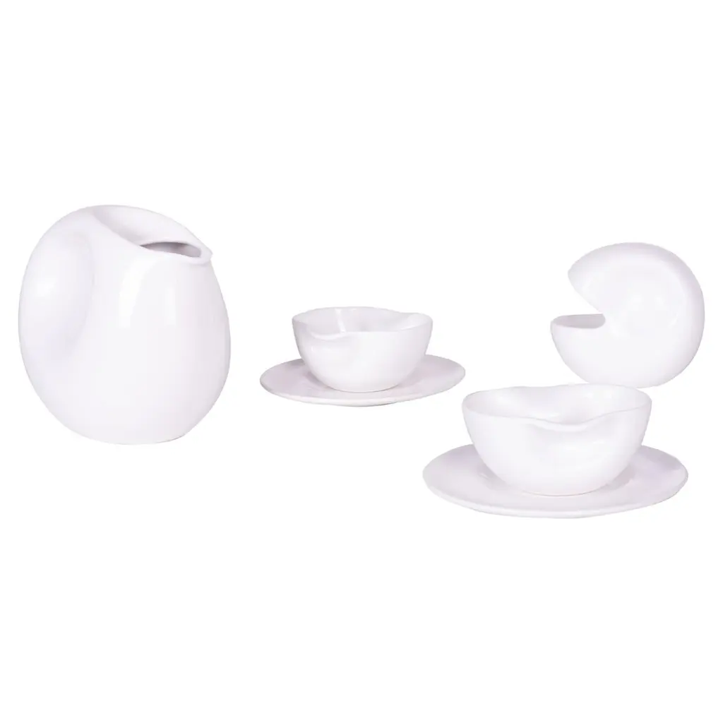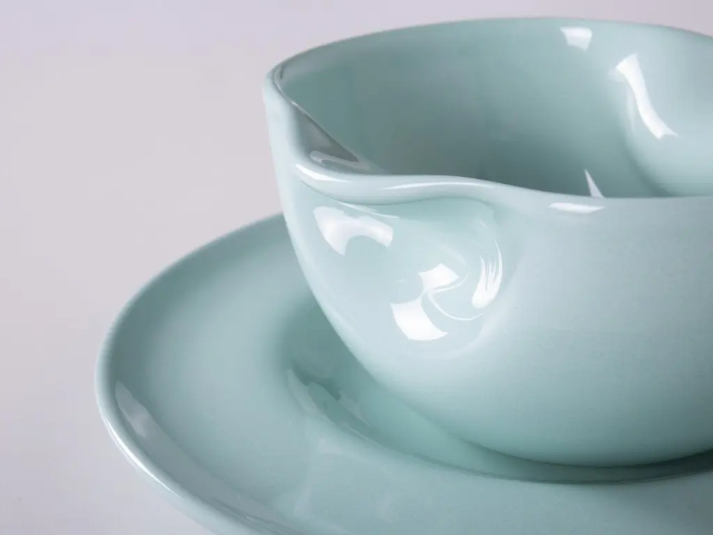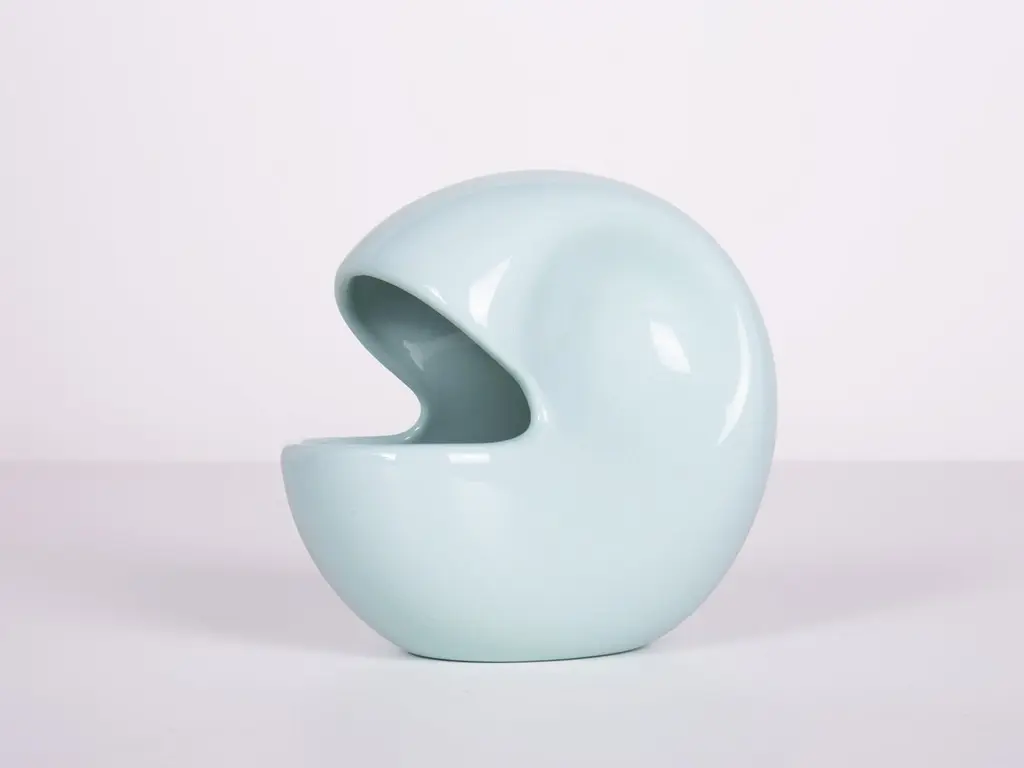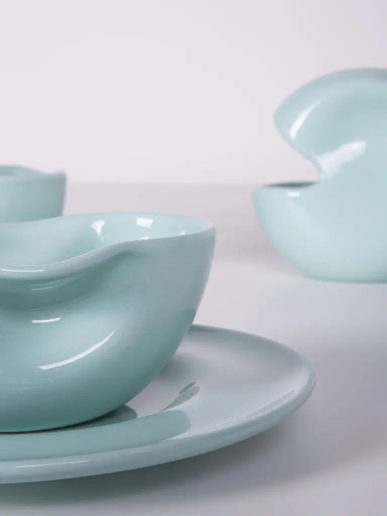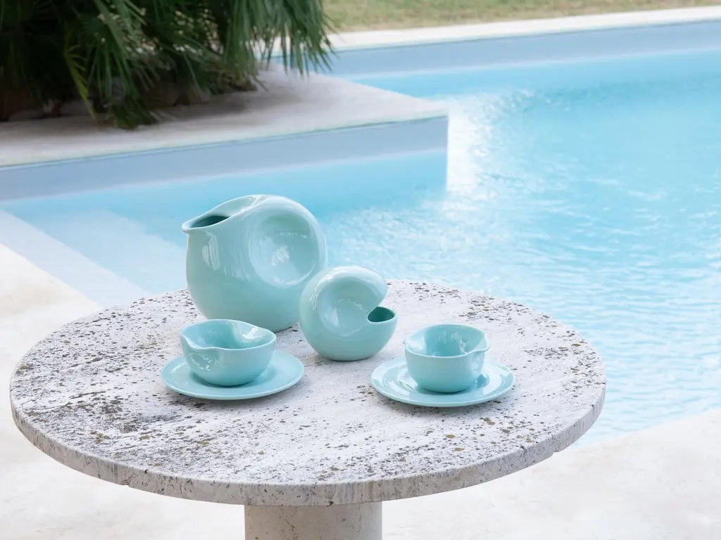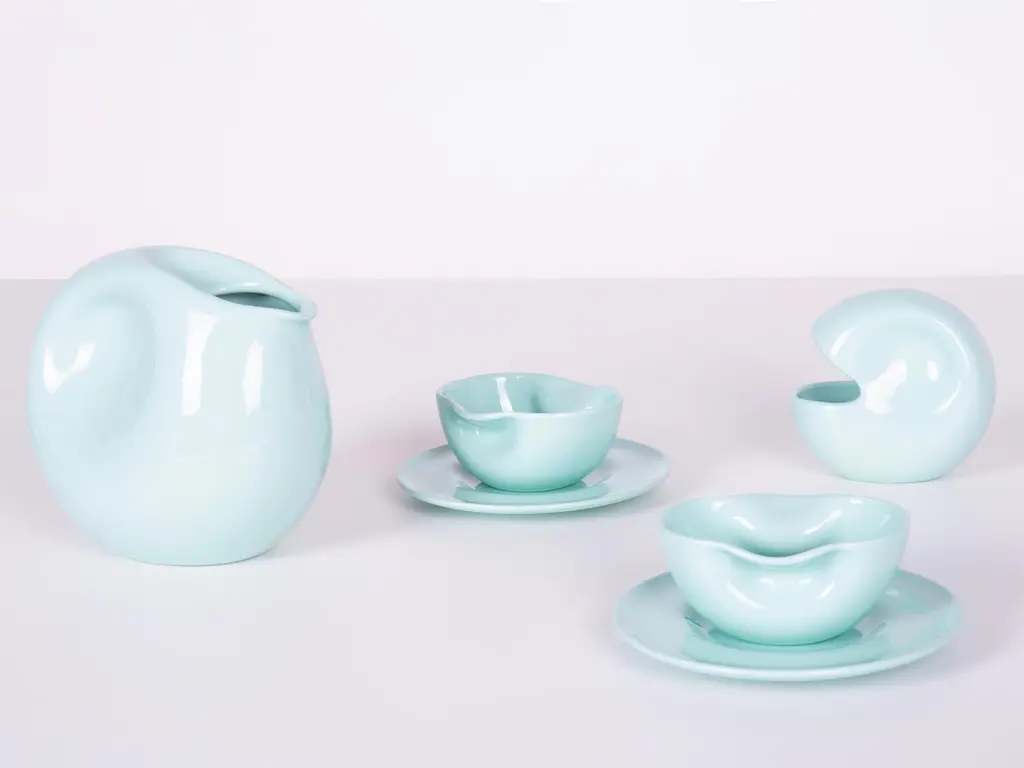 Designed in 1975 - Paradisoterrestre Edition 2023Material: enameled potteryColours: mint green; also available in white or pink.The tea set designed by Italian artist Augusto Betti in 1975 consists of 1 teapot, 1 sugar bowl, 2 cups and 2 saucers. Re-edited by Paradisoterrestre in a limited edition of 100 pieces for each colour, with numbering and signature on the teapot and Certificate of Authenticity. The three available colours – pink, mint green, white – are those originally chosen by the artist. Also available a set consisting of 1 cup and 1 saucer without numbering.“I consider the cup of this tea set my most successful design object. A hemisphere of clay was taken at two points in the vertical part below the rim and folded horizontally. A simple intervention of the hand, transversal to the development of the hemisphere, gives rise to the “grips” of the cup. We have a perfect example of how the work of the hands integrates with that of the mind in design, suggesting new solutions and how important it is to let go, not intentionally, but through doing. It is essential for the design of ceramics to have “hands in clay”, to learn to move it by understanding the wonderful possibilities it offers. The clay yields to the movement of the hand suggesting forms that go beyond intentionality. Its language cannot be known except through direct experience.” – Augusto Betti