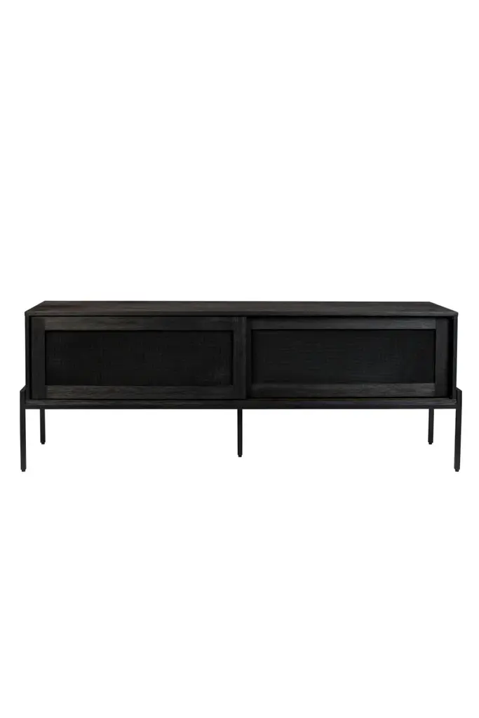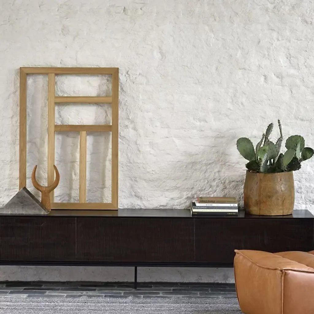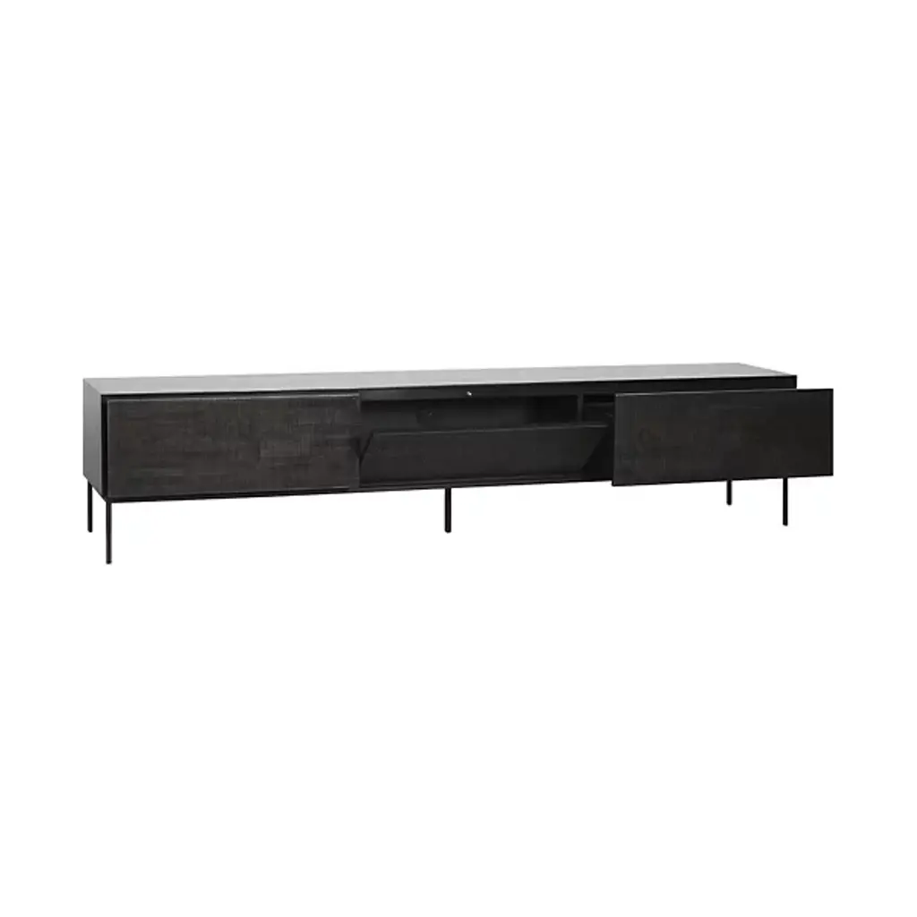 The Teak Grooves TV Cupboard - 1 Flip-Down Door - 2 Drawers by Ethnicraft presents an intriguing and appealing solution to indoor entertainment requirements. A wide rectangular frame of teak wood rises slightly from six short legs attached to a robust metal frame, offering solid support to the broad Indonesian design. Each cupboard is hand-crafted in Indonesia, lending a personal touch to the otherwise starkly styled surface. Each of the front faces features slim vertical grooves that offer a stylish contrast to the smooth frame around them, while smoothly gliding drawers sit on either side of a central flip-down panel ideal for accessory storage.