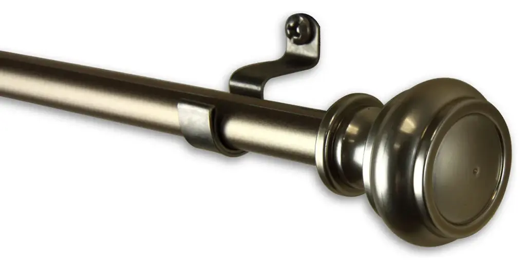 Product Details:Includes 7/16" diameter rod, 2 brackets and mounting hardwareRod Projection: 1.25"Finial measures: 1.25" x 1.38" x 1.25"High quality adjustable steel rod in satin nickel extends from 18" to 28"