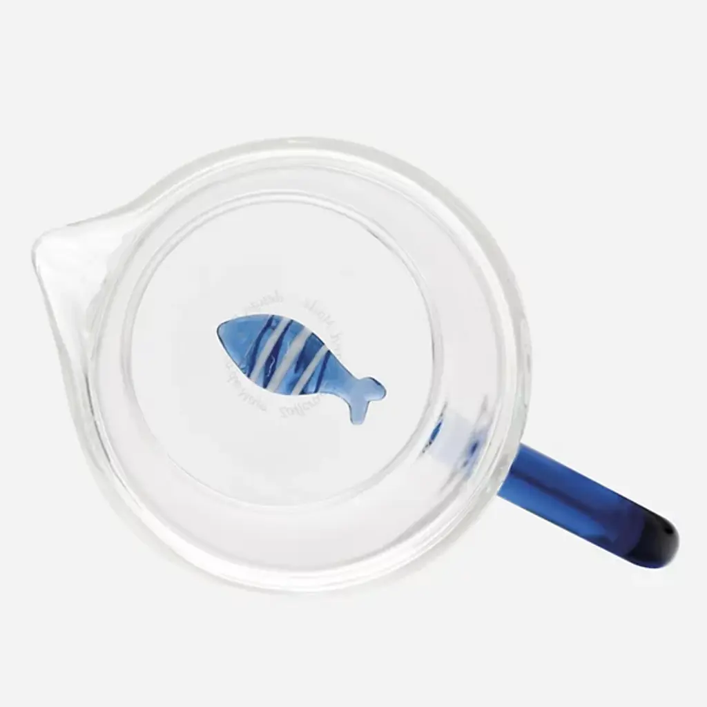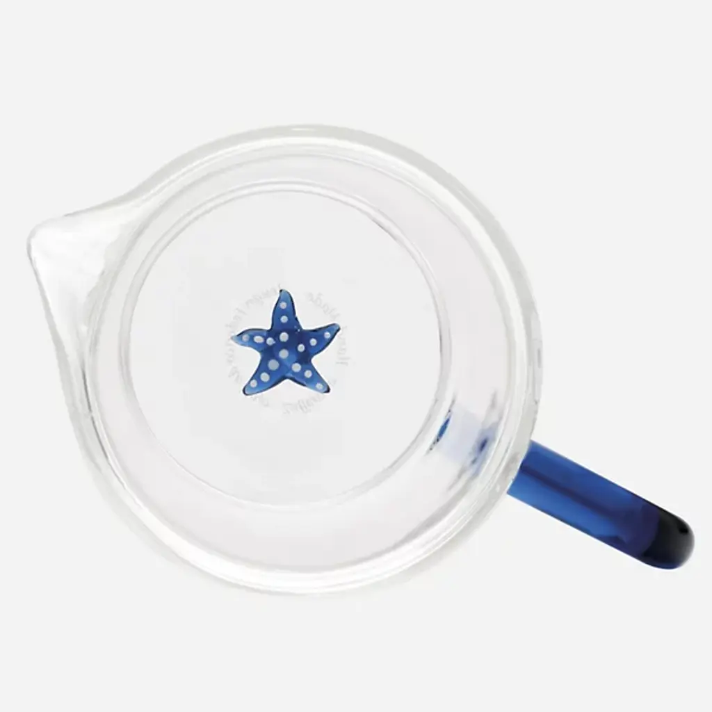 The Teca Mare Carafe from Zafferano America embellishes a conventional carafe shape with a bespoke oceanic emphasis. Designed by Federico De Majo, its cylindrical borosilicate glass body is accented by a slim blue handle. A double-bottom chamber holds the signature, handmade glass sea creatures within the base, adding a marine character. Signed with a script that frames the creature below and declares its handmade artistry, it offers a refreshing approach to serving beverages that pair well with the matching tumbler set.