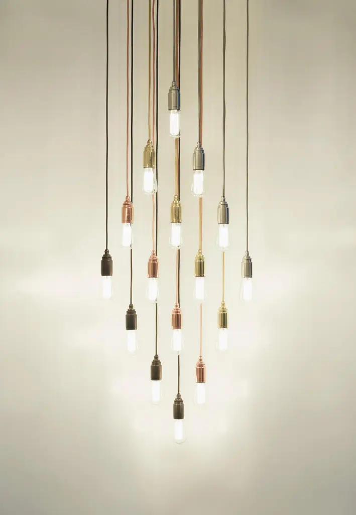 Lamp holder with ceiling plate in brass and metal-covered cable. Standard with 2m of cable. For indoor use only (IP20).Caret squirrel cage lamp 7,7W E27 2300K. Main power 230V 50Hz.