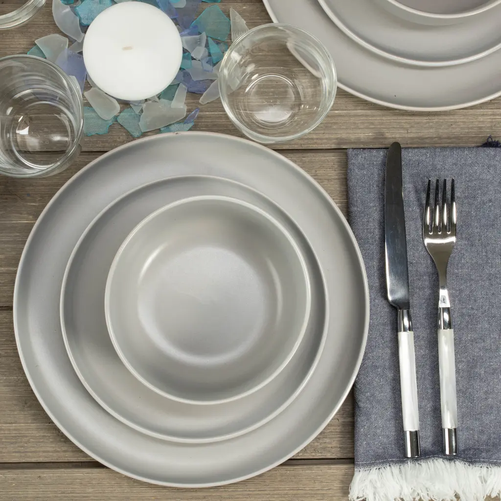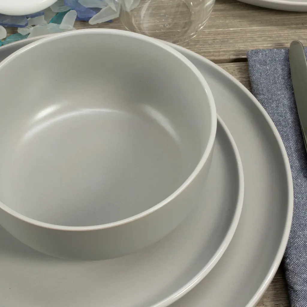 The BIA Cordon Bleu Stoneware Tempo 12-Piece Dinnerware Set in Stone is perfect for all your dining needs. This set includes 4 salad plates measuring 7.75", 4 dinner plates measuring 10.25", and 4 bowls measuring 5.5" x 2.25" with a capacity of 24 oz. With its modern white rim and contemporary Stone color, this set adds a touch of elegance to any table. The semi-matte finish gives it a sleek and sophisticated look. Made of durable stoneware, these dishes are oven safe, microwave safe, and dishwasher safe, making them perfect for everyday use. Whether you're hosting a casual dinner or special occasion, this dinnerware set is sure to impress. BIA Cordon Bleu: Designed With Modern Sensibility For Wherever You Live, However You Cook, And Whenever You Entertain.