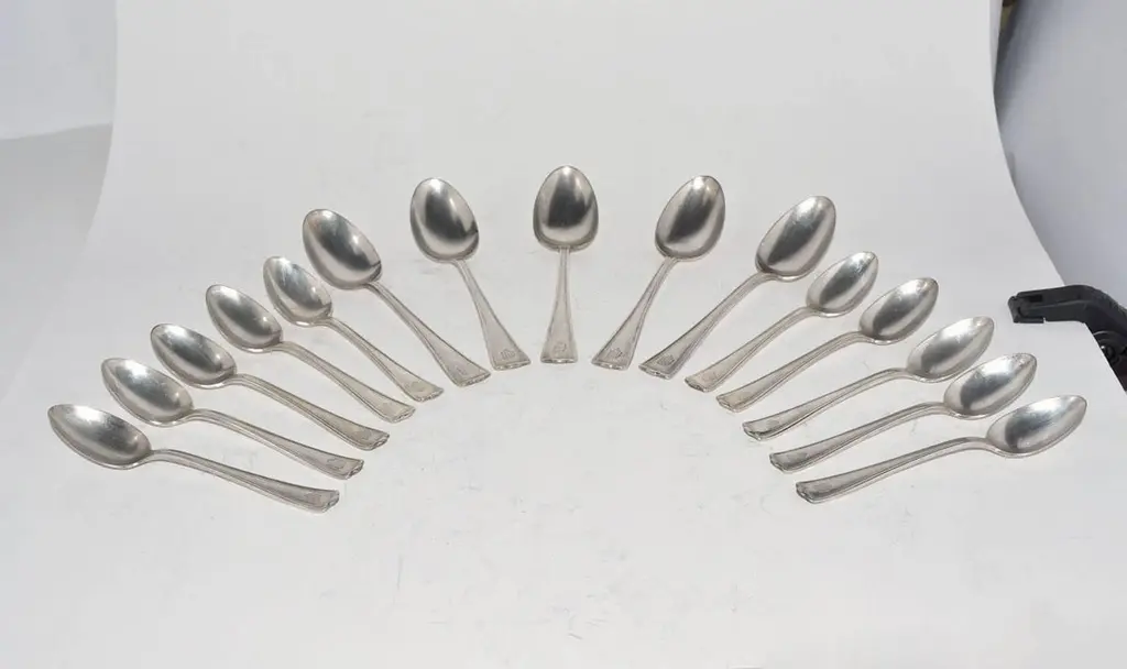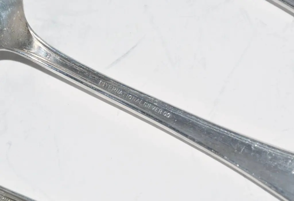 The 10 vintage silver-plated teaspoons and 5 large soup spoons are stamped "International Silver Co." They also have an undecipherable monogram.The soup spoon and teaspoons can be sold separately.18 dinner forks in the same patter are available.Measurement for soup spoons - Length 7" D 1.5", H .5"