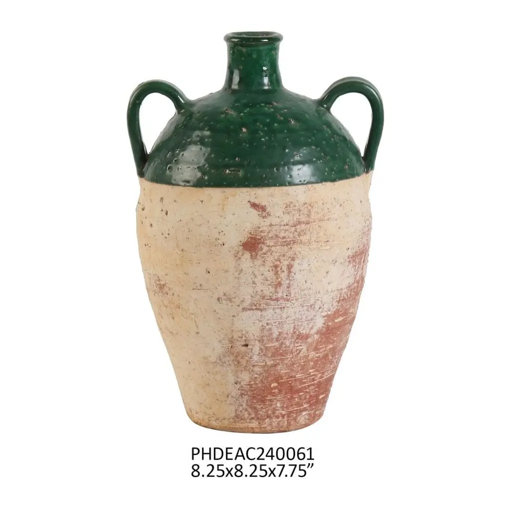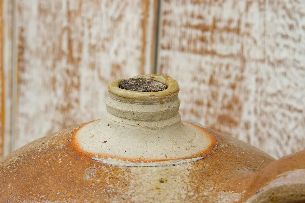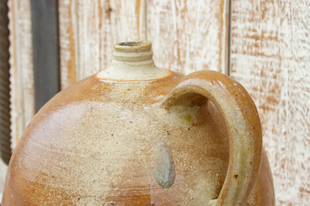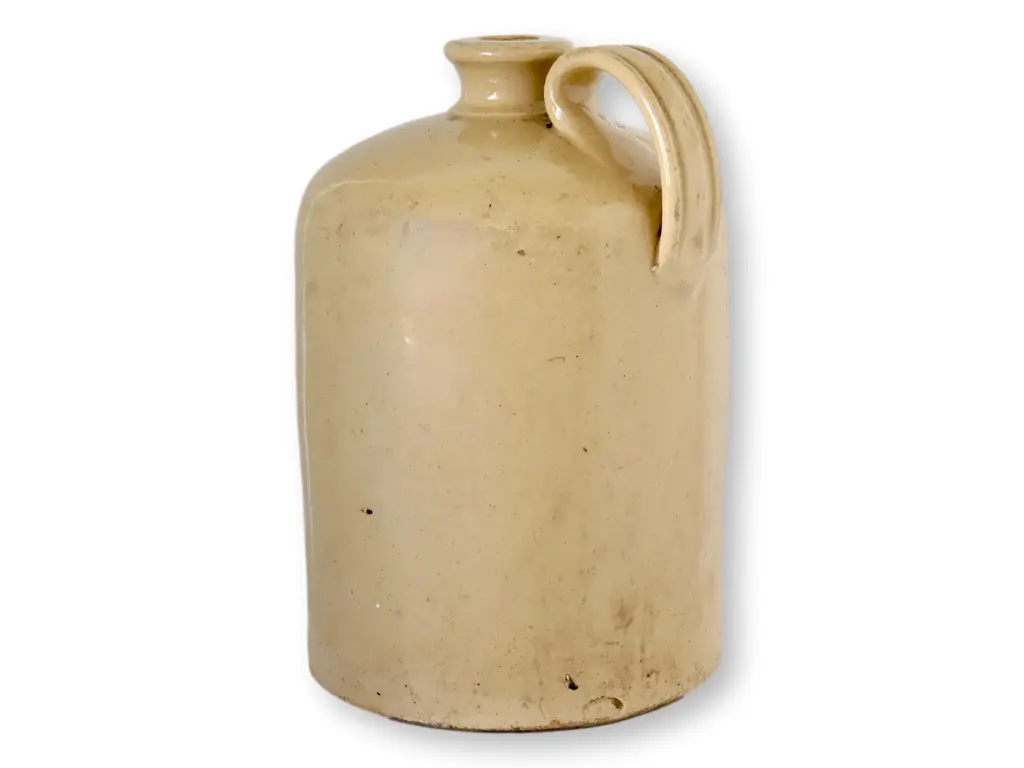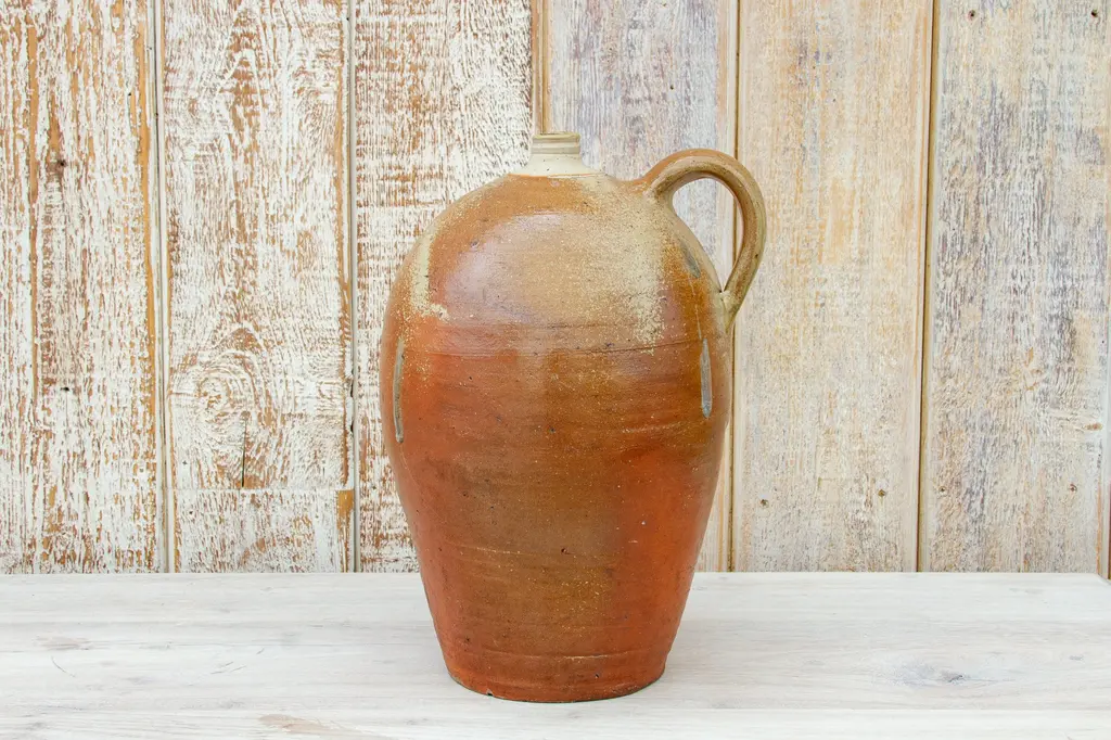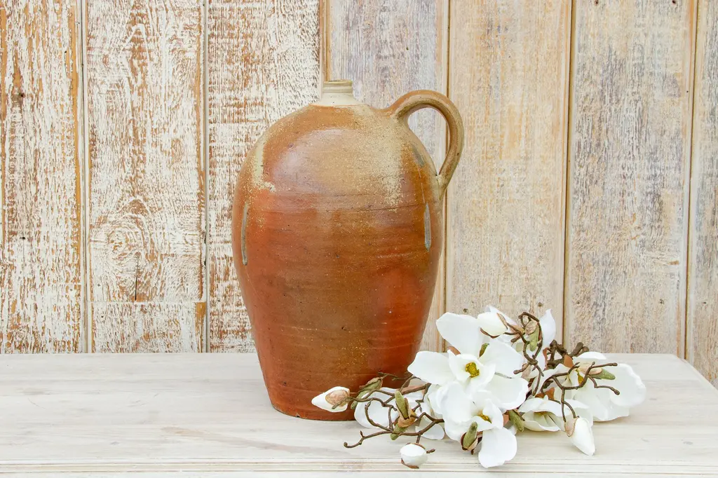 Charming early to mid 20th century clay jug from the Normandy coastline in France. This antique jug was used to store and serve either wine or apple cider. It features a lovely aged matte finish with a handle and short and small spout.