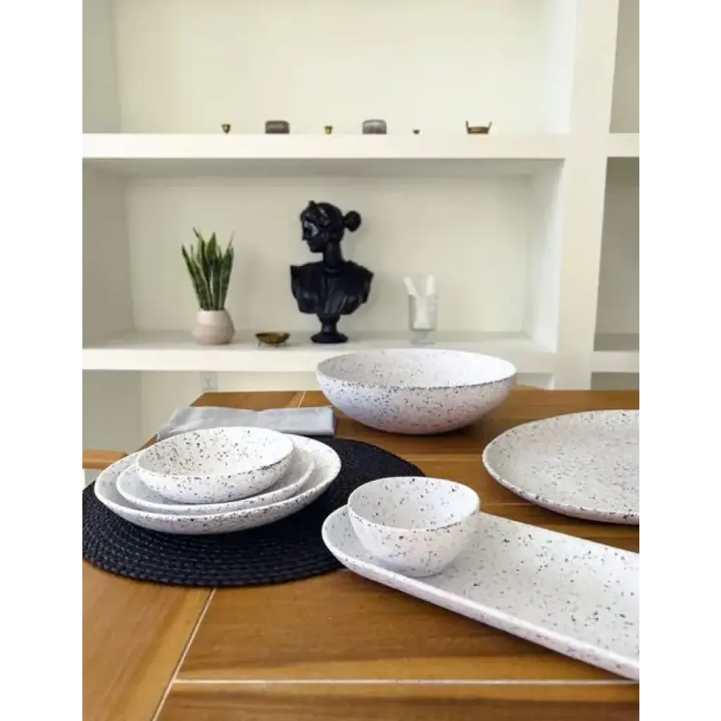Crafted from recycled melamine, this sustainable line showcases a distinctive speckled design that combines durability with eco-conscious elegance. Ideal for mindful entertainers, it offers a durable, dishwasher- safe option that maintains a stylish aesthetic.