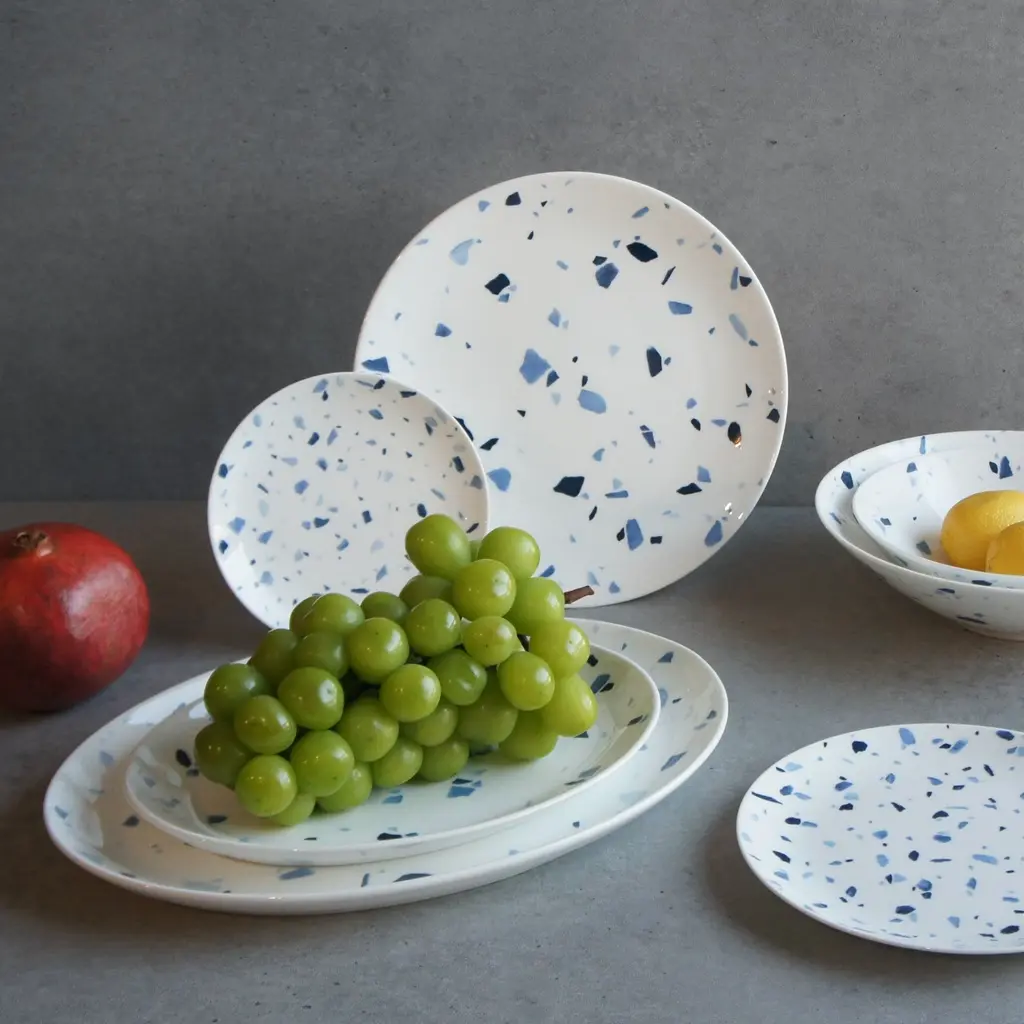 Terrazzo tiles are well known for mixing chips of marble, granite and other stones into the base material for tiles to create visual appeal in otherwise plain surfaces. This style was particularly popular during the art-deco period of architecture. Using the traditional blue-and-white color combination of Bone Chinaware and the inspiration from this type of surface treatment, Twig New York presents the Terrazzo Azzurro collection. Ideal for ServingOne platter per boxFine Bone China with hand-applied decalPlate: 14 in. widthDishwasher & Microwave safeTerrazzo Azzurro Collection