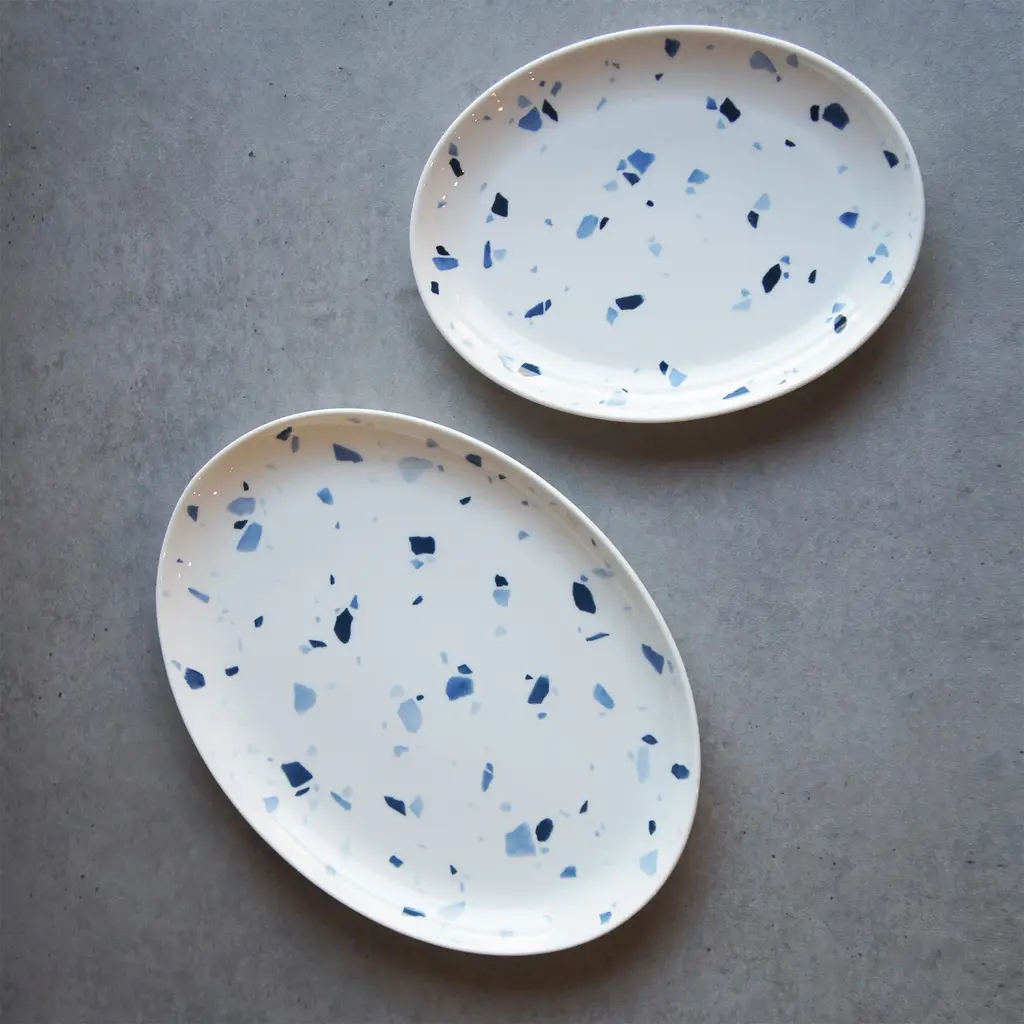 Inspired by the beauty of mosaic-like tiles, the Terrazzo Azzurro Dinnerware collection features blue-toned flecks of color on fine bone china that's both dishwasher and microwave safe.