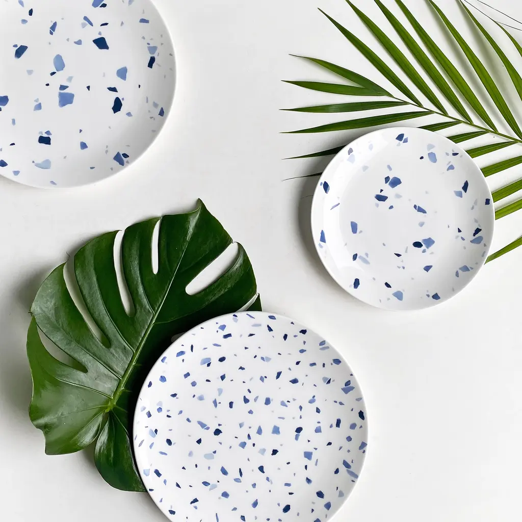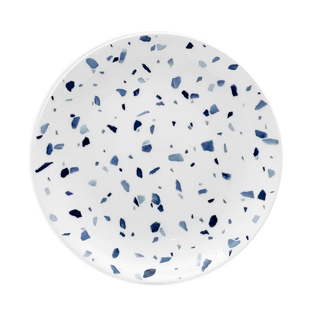 Inspired by the beauty of mosaic-like tiles, the Terrazzo Azzurro Dinnerware collection features blue-toned flecks of color on fine bone china that's both dishwasher and microwave safe.