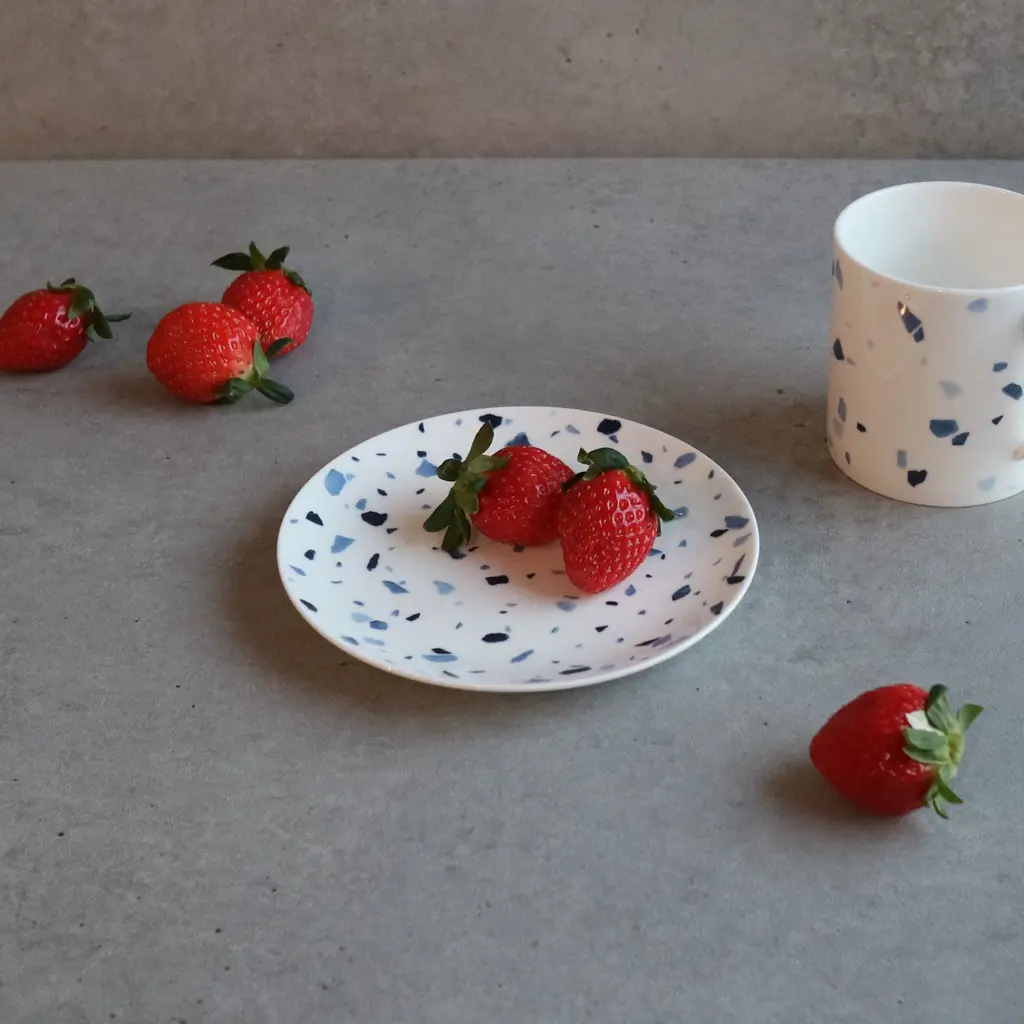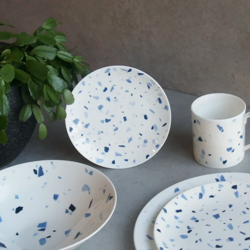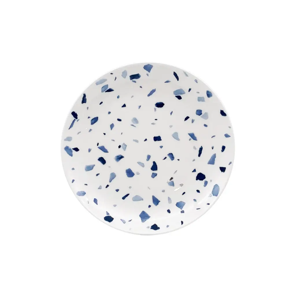 Terrazzo tiles are well known for mixing chips of marble, granite and other stones into the base material for tiles to create visual appeal in otherwise plain surfaces. This style was particularly popular during the art-deco period of architecture. Using the traditional blue-and-white colour combination of Bone Chinaware and the inspiration from this type of surface treatment, Twig New York presents the Terrazzo Azzurro collection. Ideal for Salads and AppetizersTwo plates per boxFine Bone China with hand applied decalDishwasher & Microwave safeTerrazzo Azzurro Collection